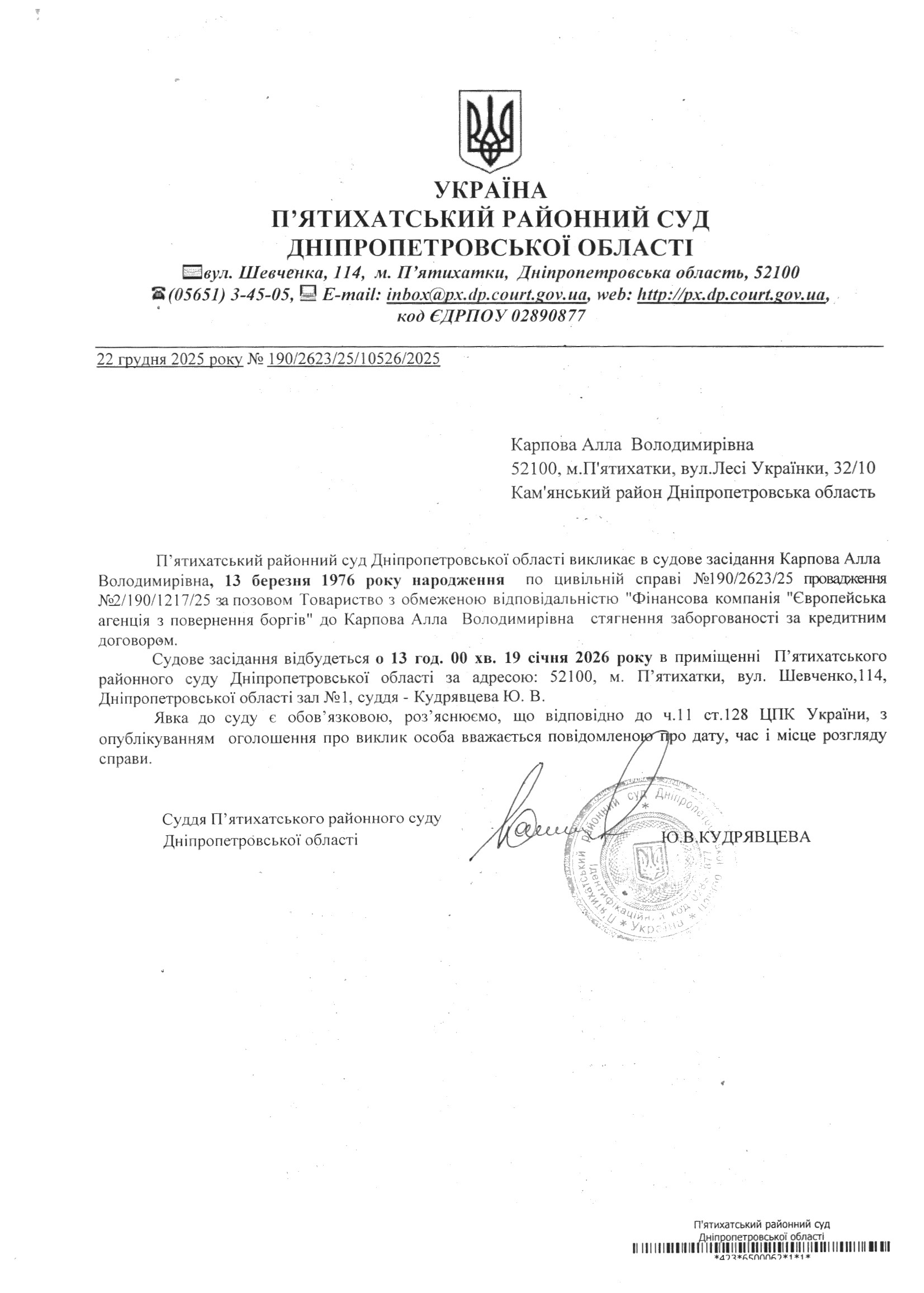 Про виклик в судове засідання Карпова Алла Володимирівна