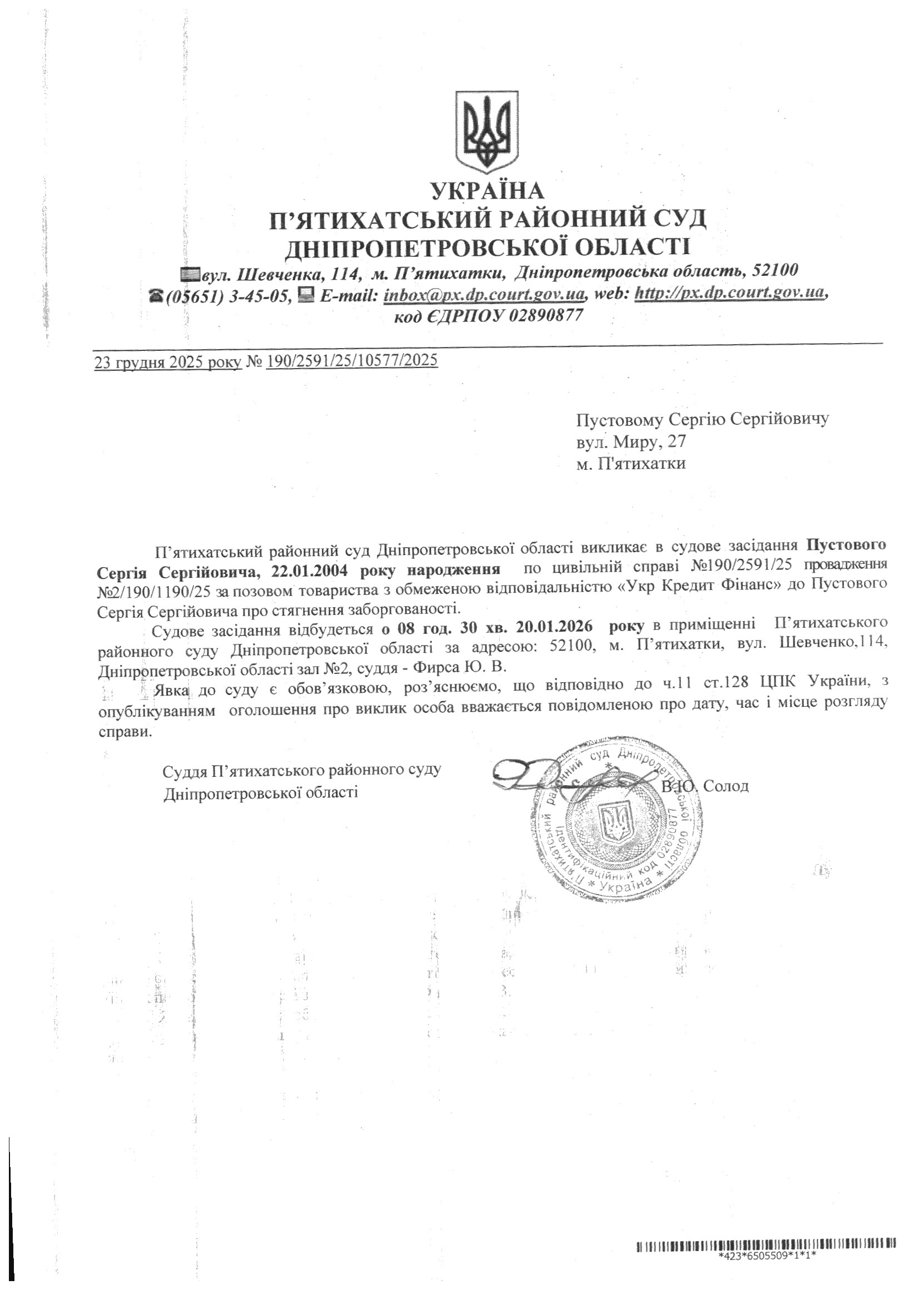 Про виклик в судове засідання Пустовий Сергій Сергійович
