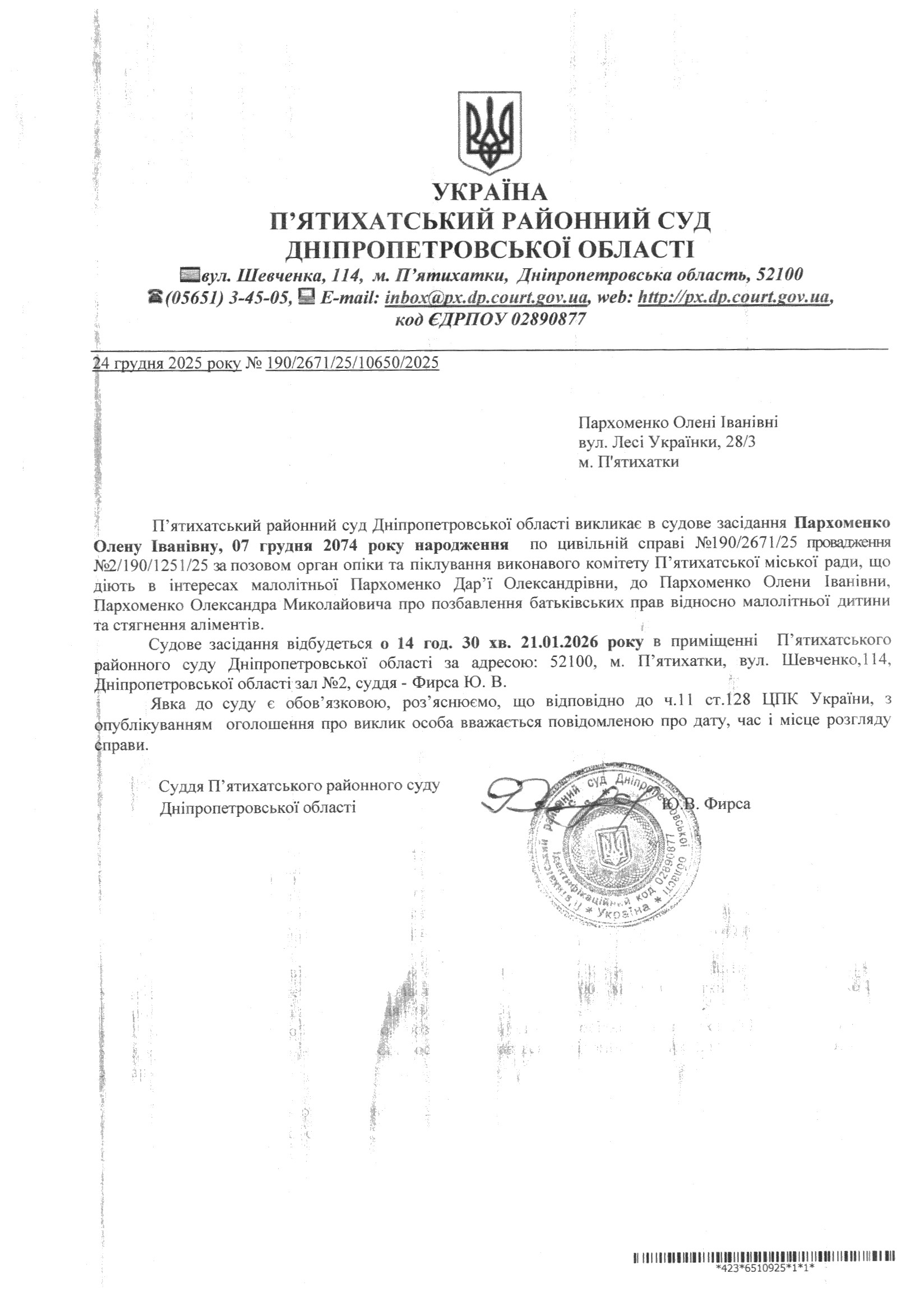 Про виклик в судове засідання Пархоменко Олена Іванівна