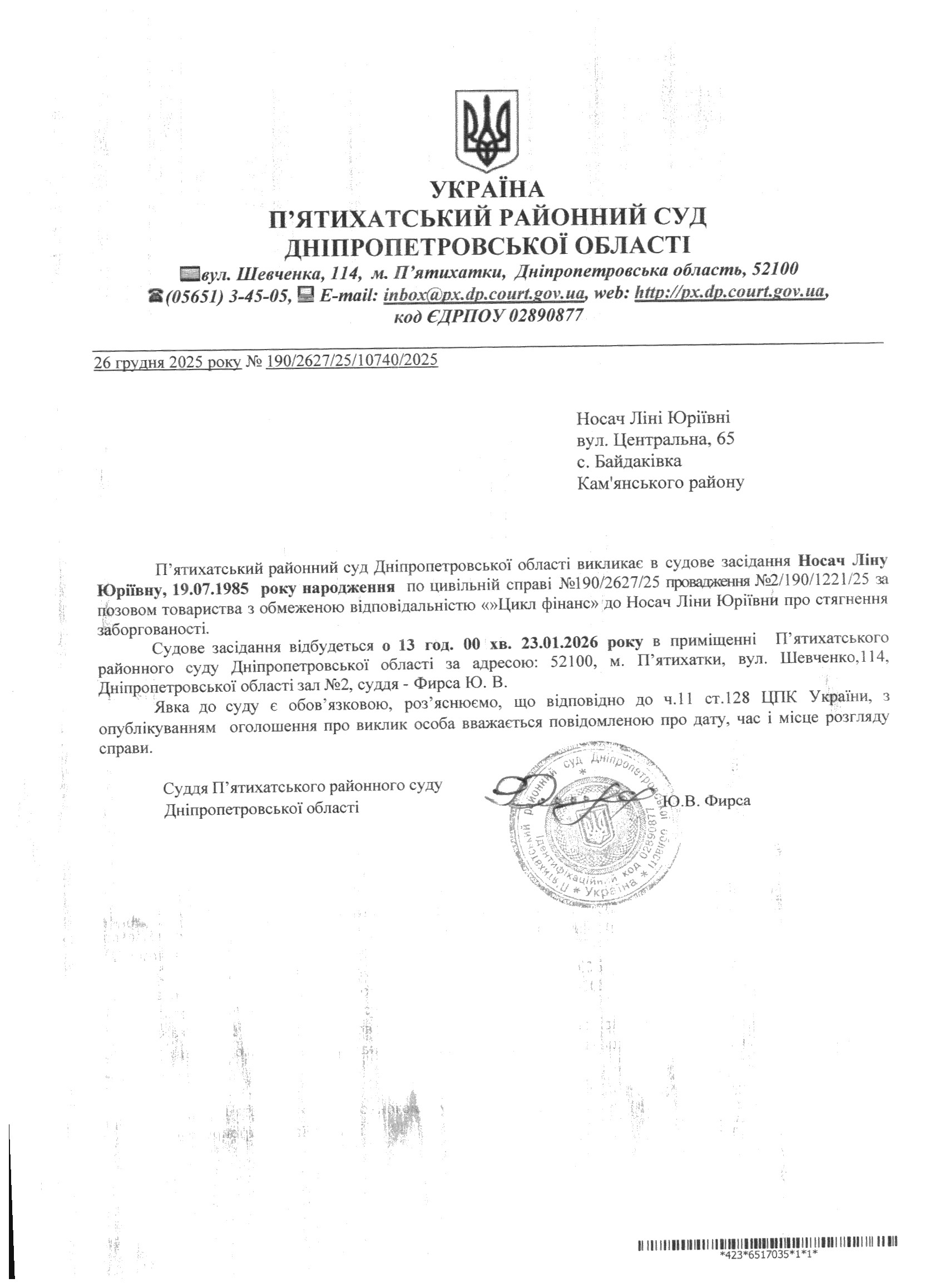 Про виклик в судове засідання Носач Ліна Юріївна