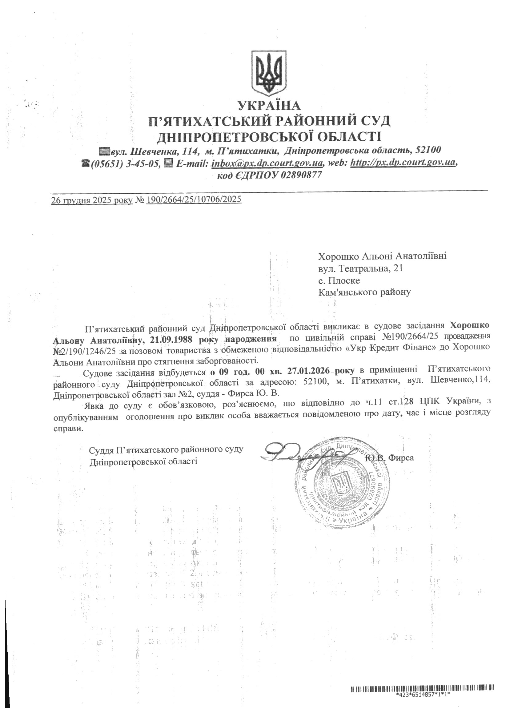 Про виклик в судове засідання Хорошко Альона Анатоліївна