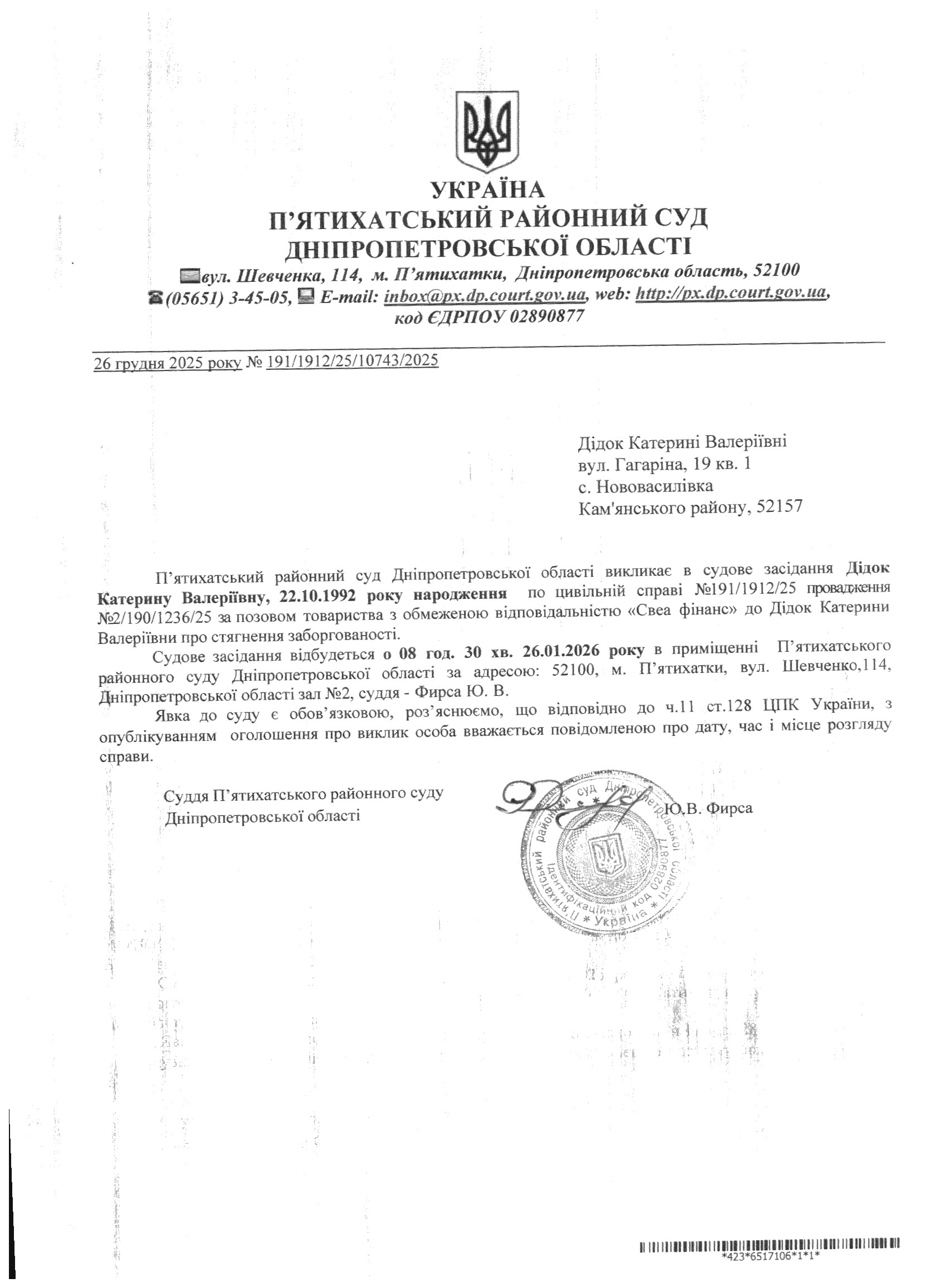 Про виклик в судове засідання Дідок Катерина Валеріївна