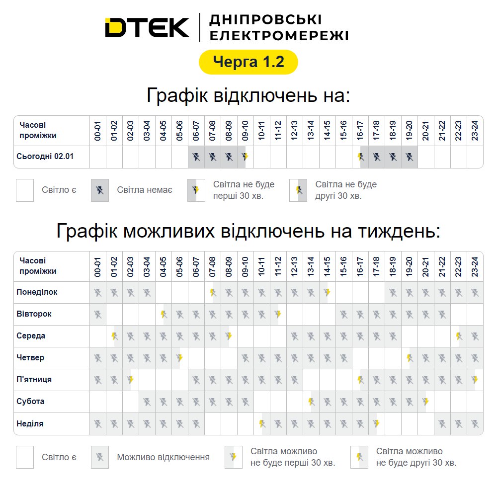 Графік стабілізаційних відключень черга 1.2 на 02.01.2026