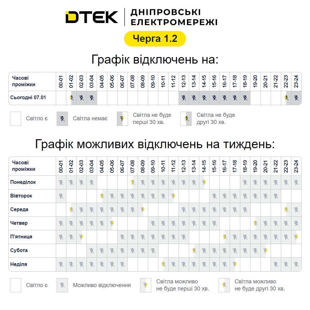Графік стабілізаційних відключень черга 1.2 на 07.01.2026