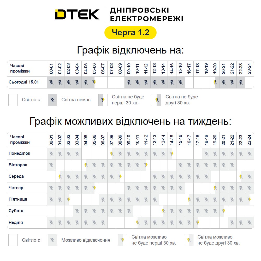 Графік стабілізаційних відключень черга 1.2 на 15.01.2026