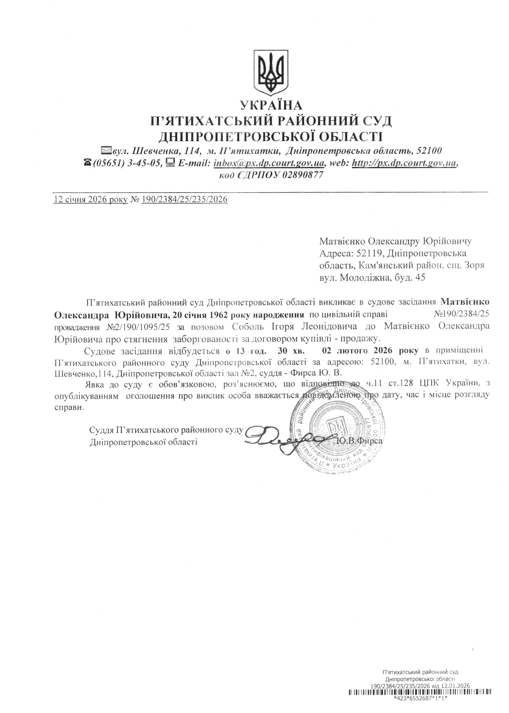 Про виклик в судове засідання Матвієнко Олександр Юрійович