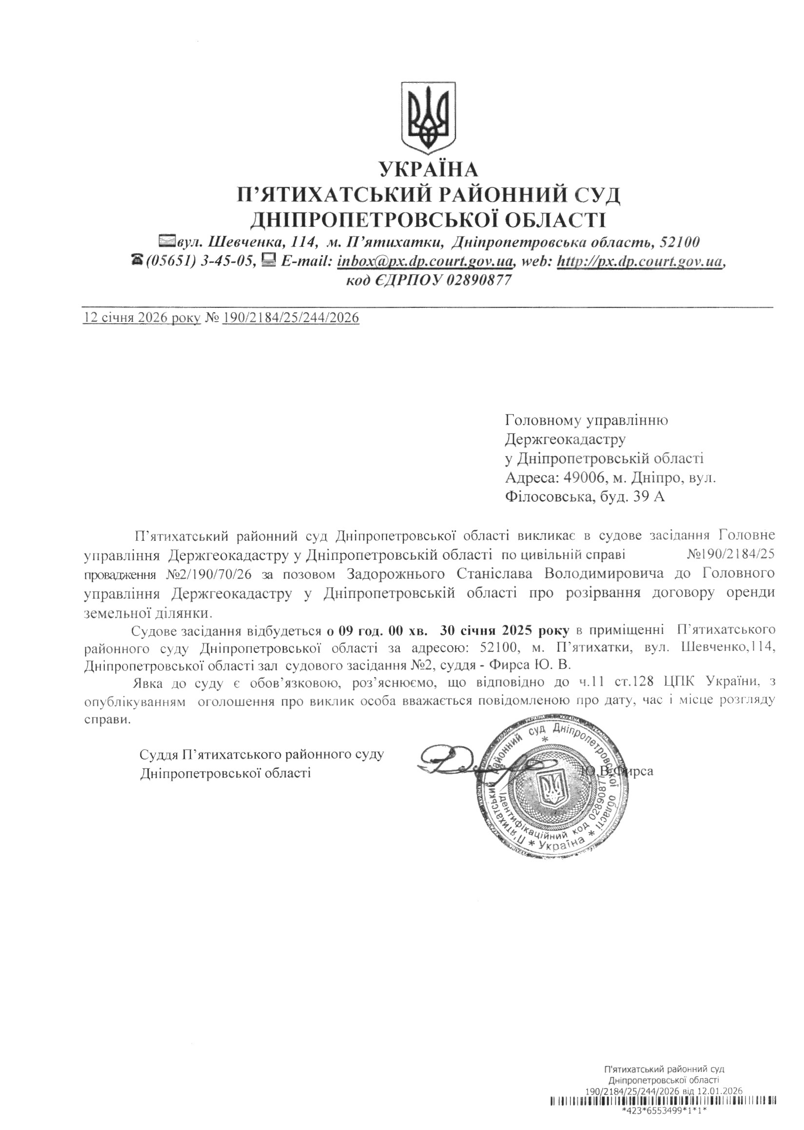 Про виклик в судове засідання ГУ Держгеокадастру у Дніпропетровській області