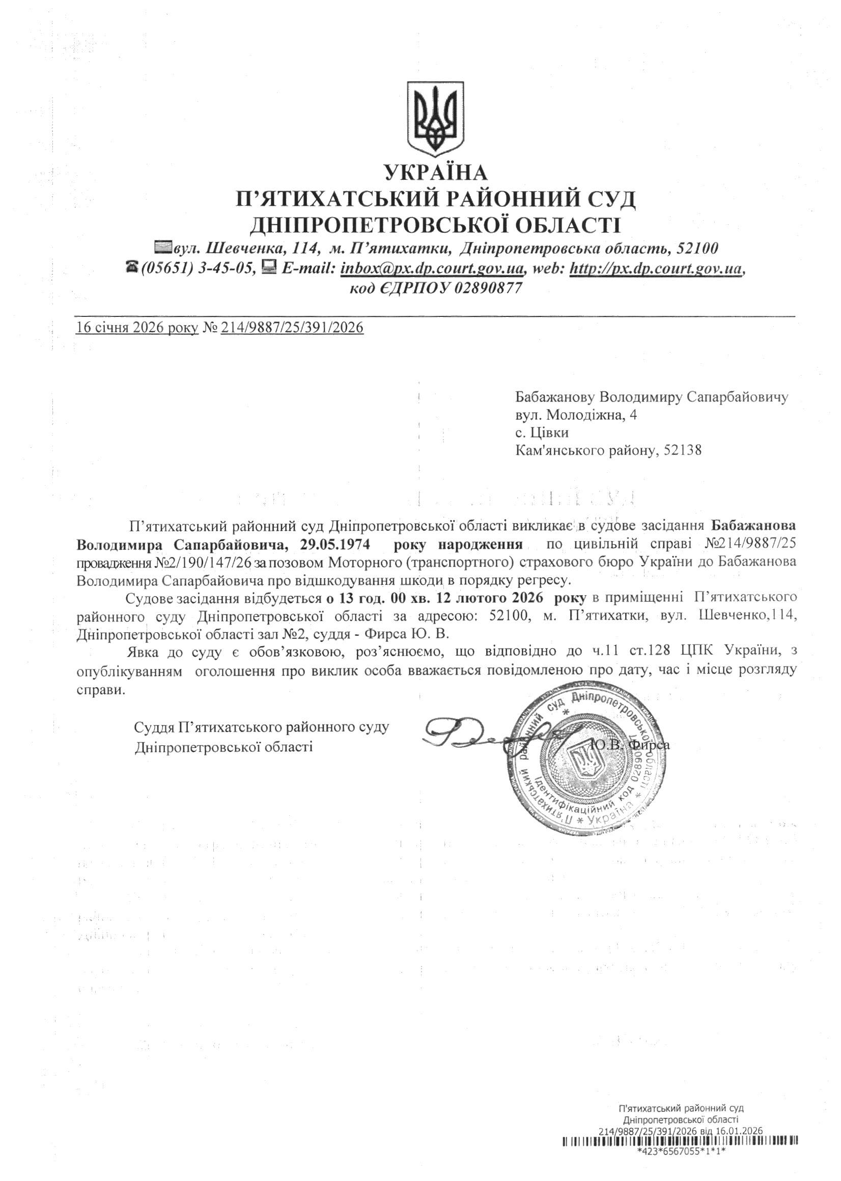 Про виклик в судове засідання Бабажанов Володимир Сапарбайович