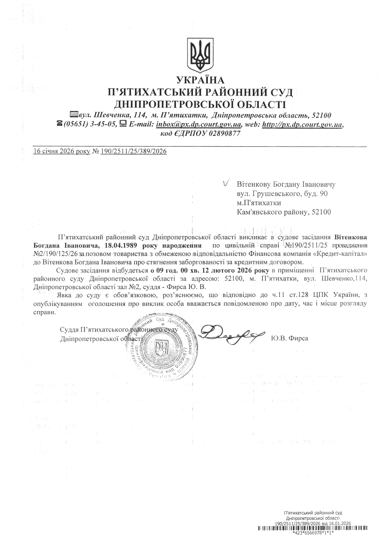 Про виклик в судове засідання Вітенков Богдан Іванович