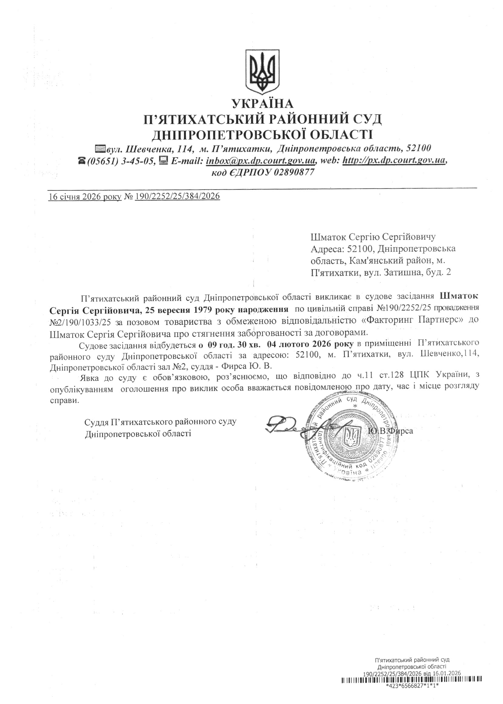 Про виклик в судове засідання Шматок Сергій Сергійович