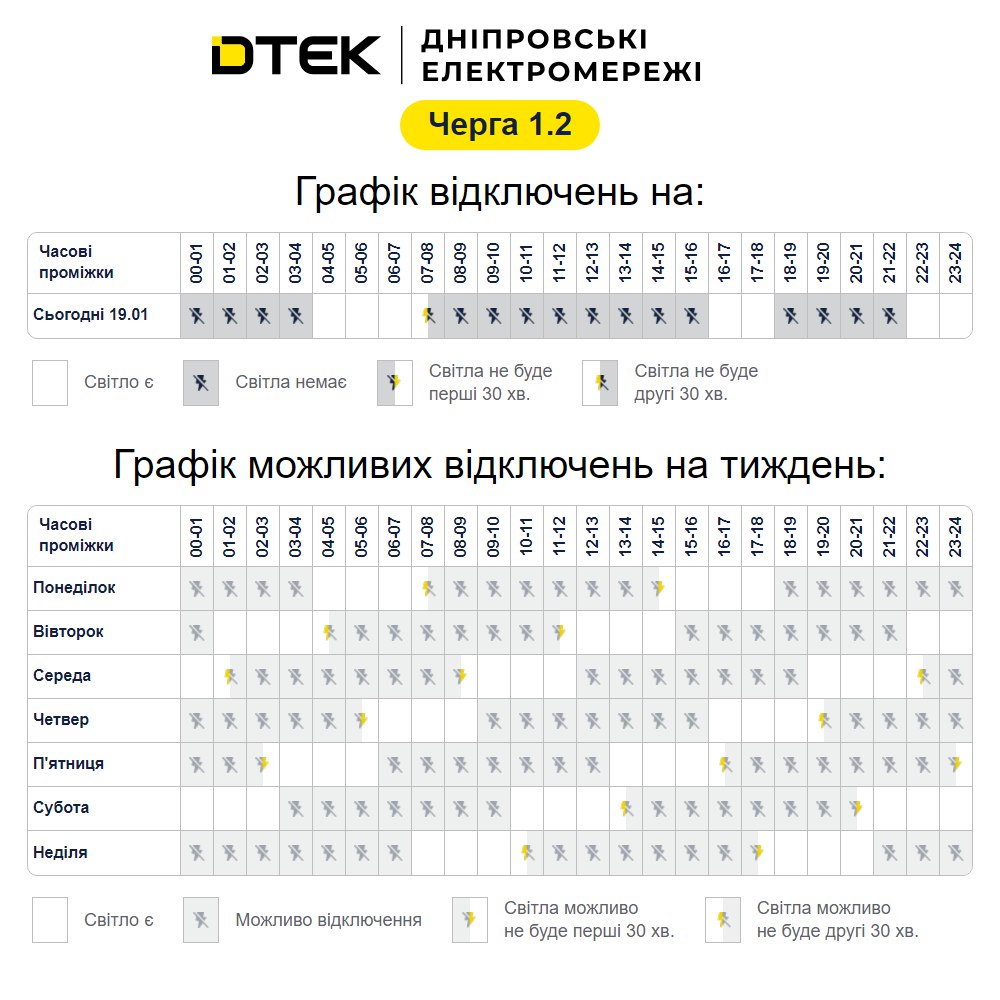 Графік стабілізаційних відключень черга 1.2 на 19.01.2026