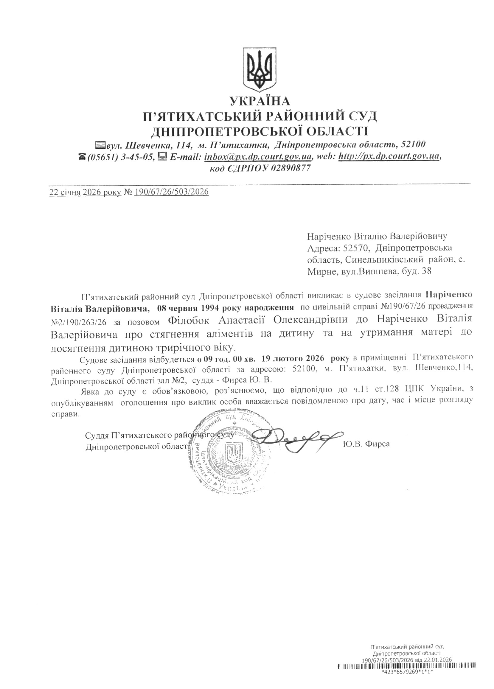 Про виклик в судове засідання Наріченко Віталій Валерійович