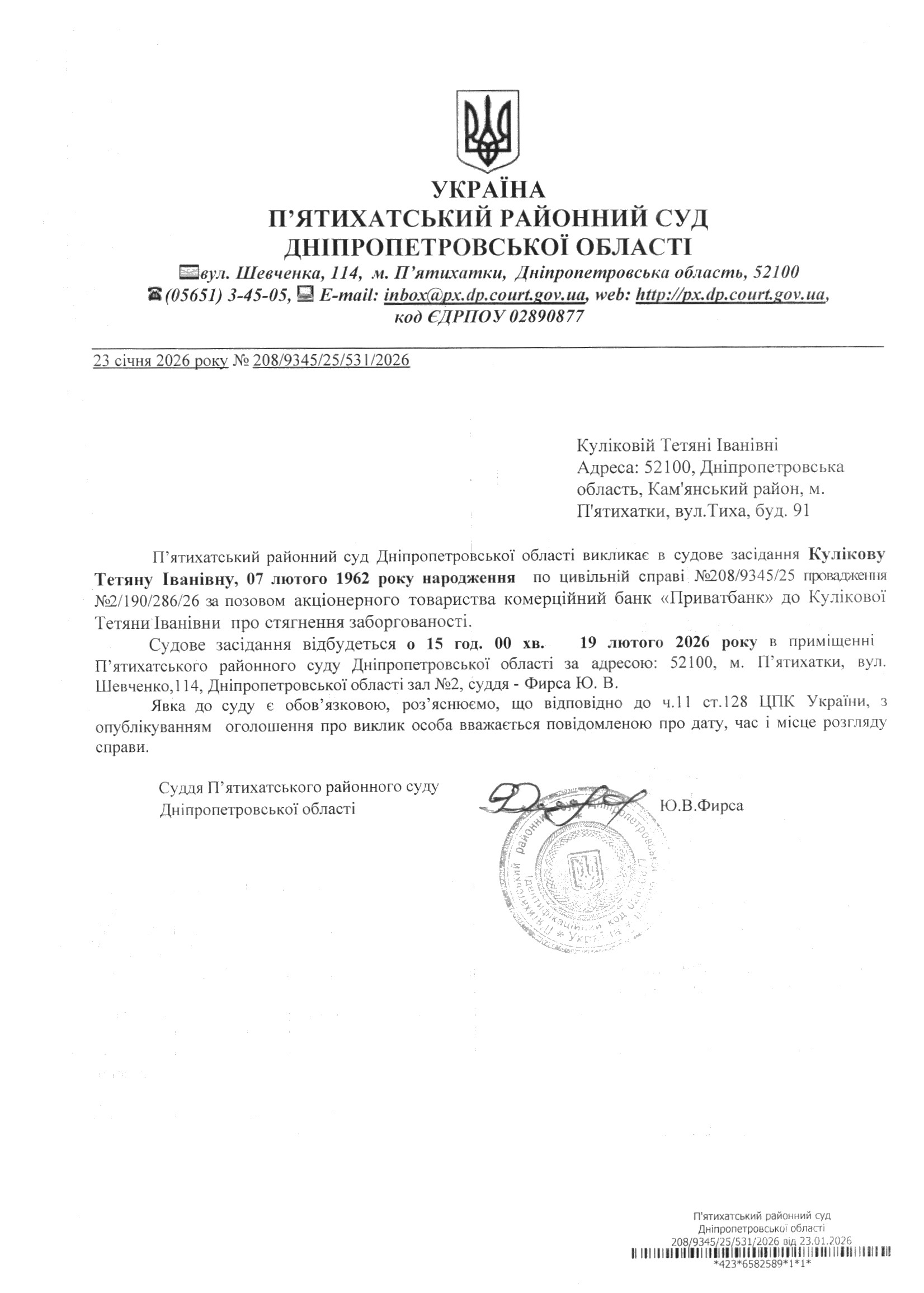 Про виклик в судове засідання Кулікова Тетяна Іванівна