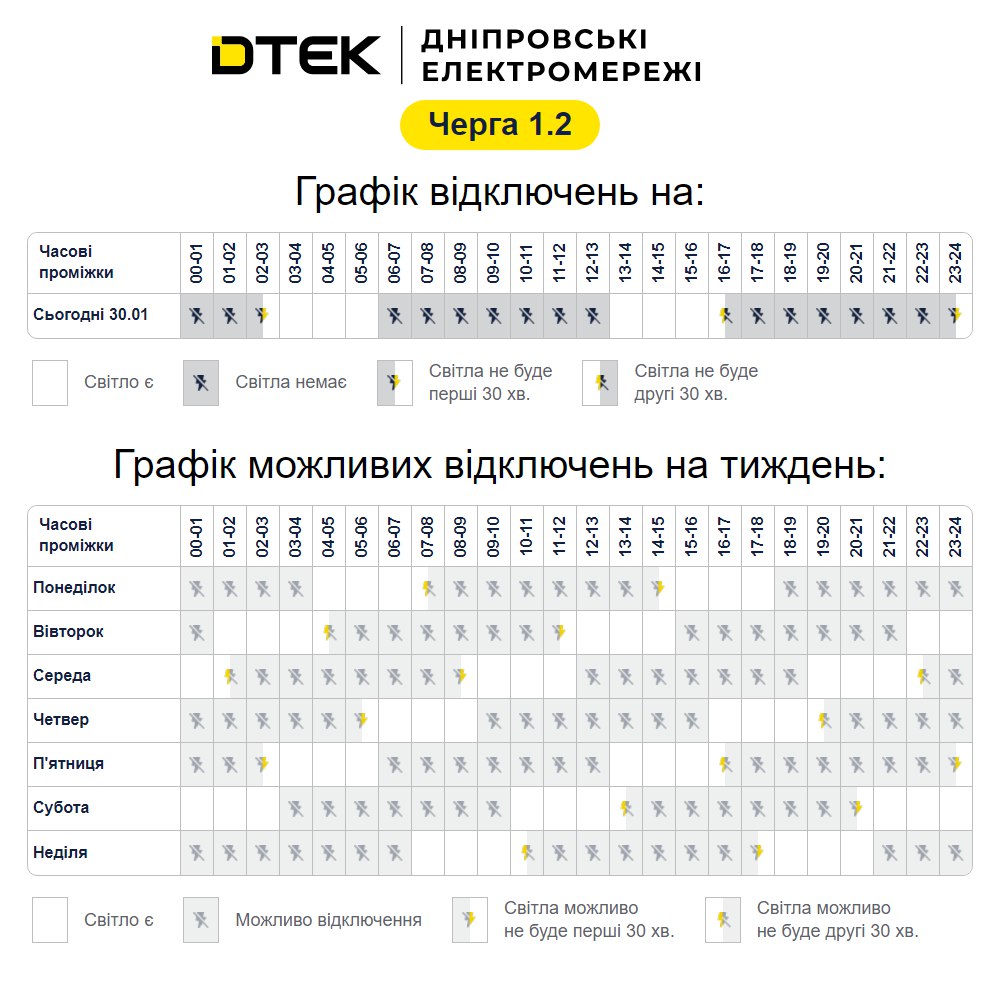 Графік стабілізаційних відключень черга 1.2 на 30.01.2026