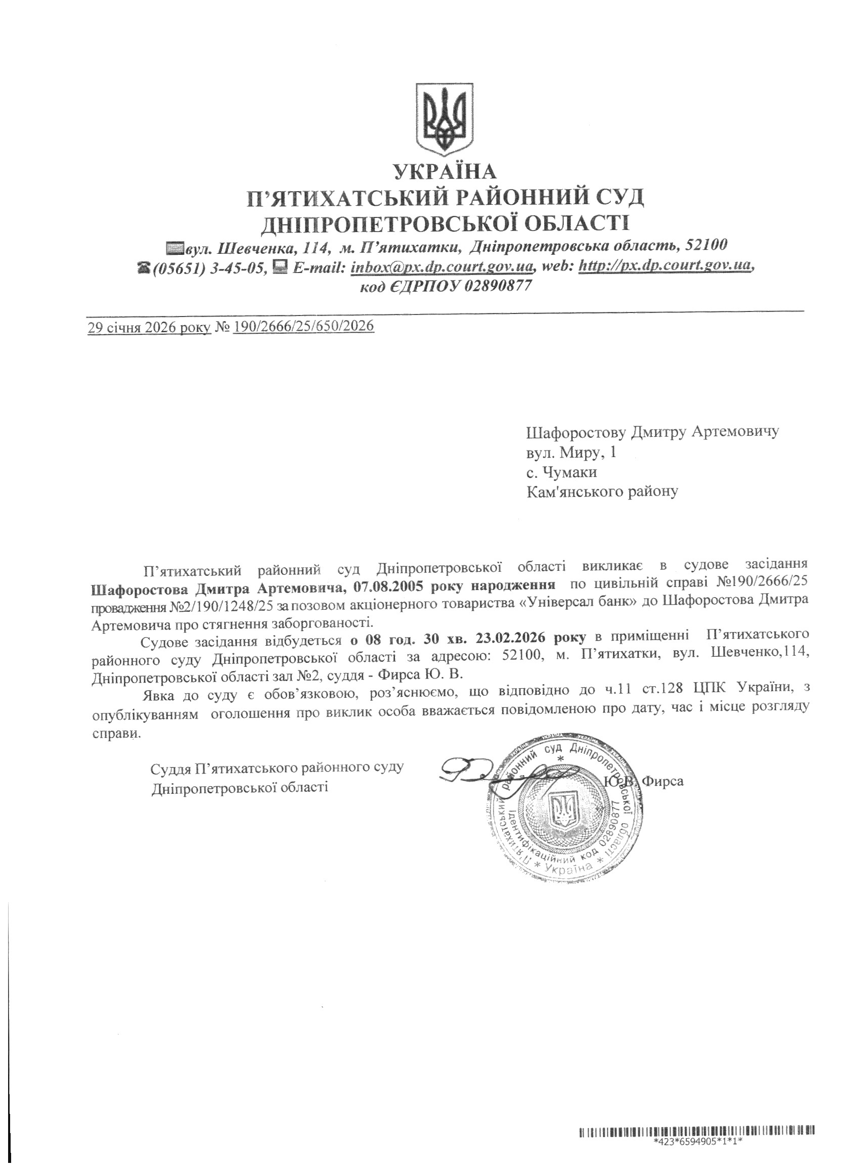 Про виклик в судове засідання Шафоростов Дмитро Артемович