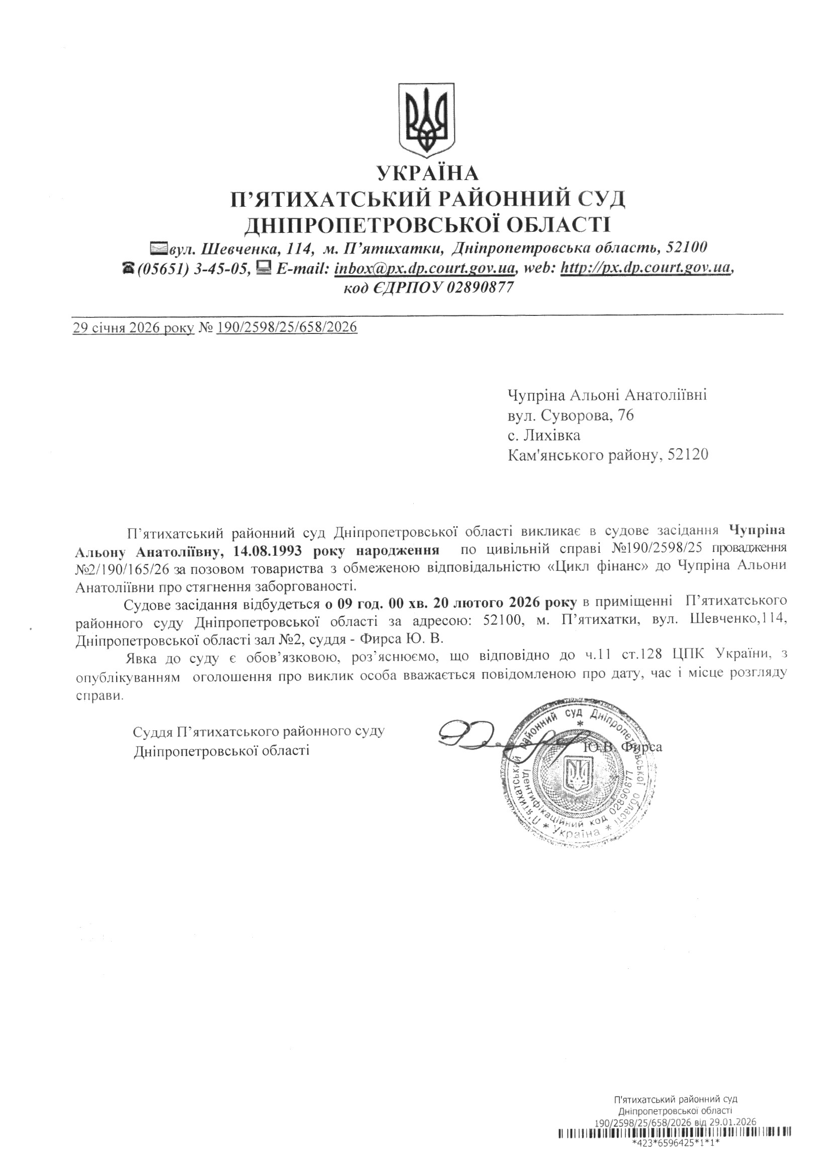 Про виклик в судове засідання Чупріна Альона Анатоліївна