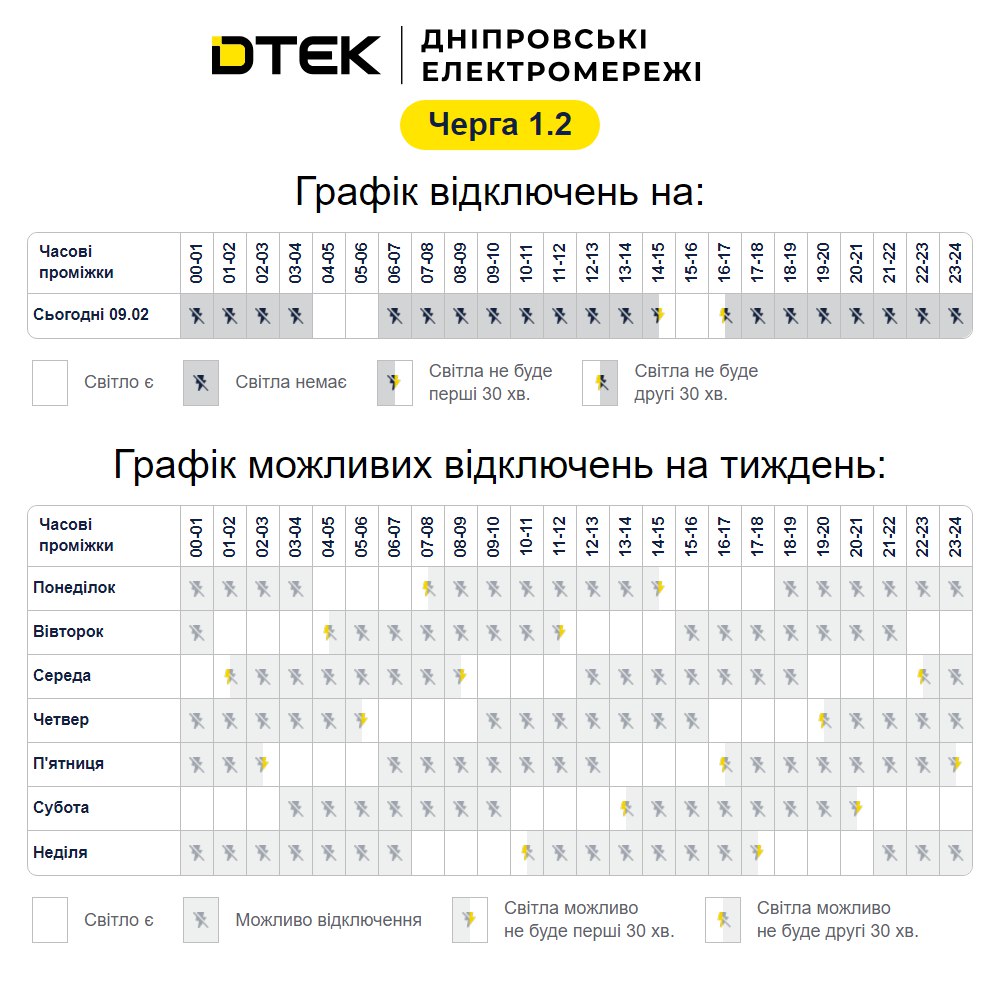 Графік стабілізаційних відключень черга 1.2 на 09.02.2026