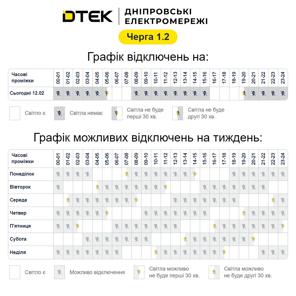 Графік стабілізаційних відключень черга 1.2 на 12.02.2026