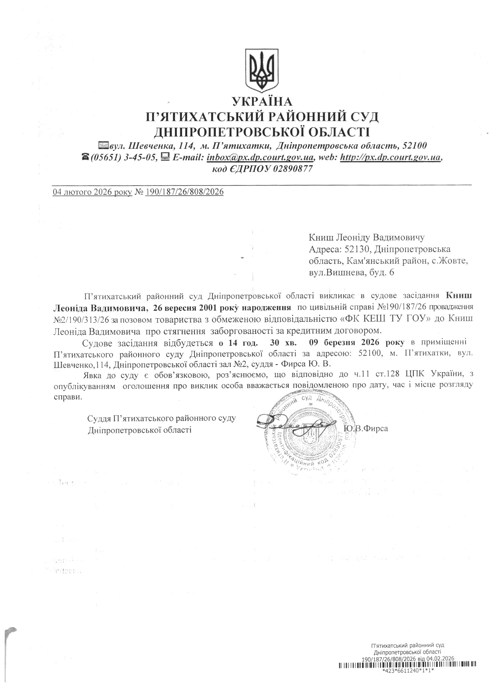 Про виклик в судове засідання Книш Леонід Вадимович