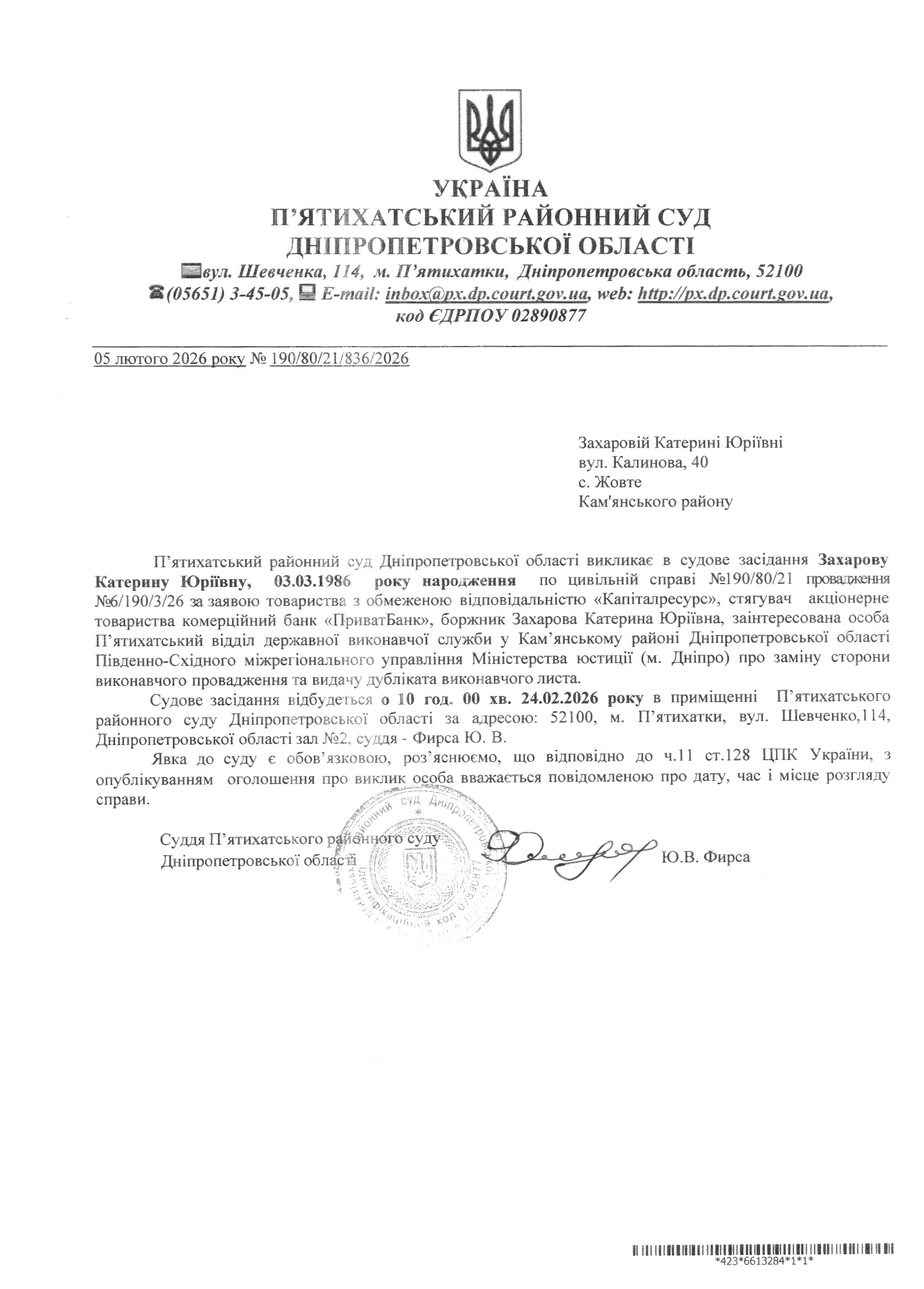 Про виклик в судове засідання Захарова Катерина Юріївна