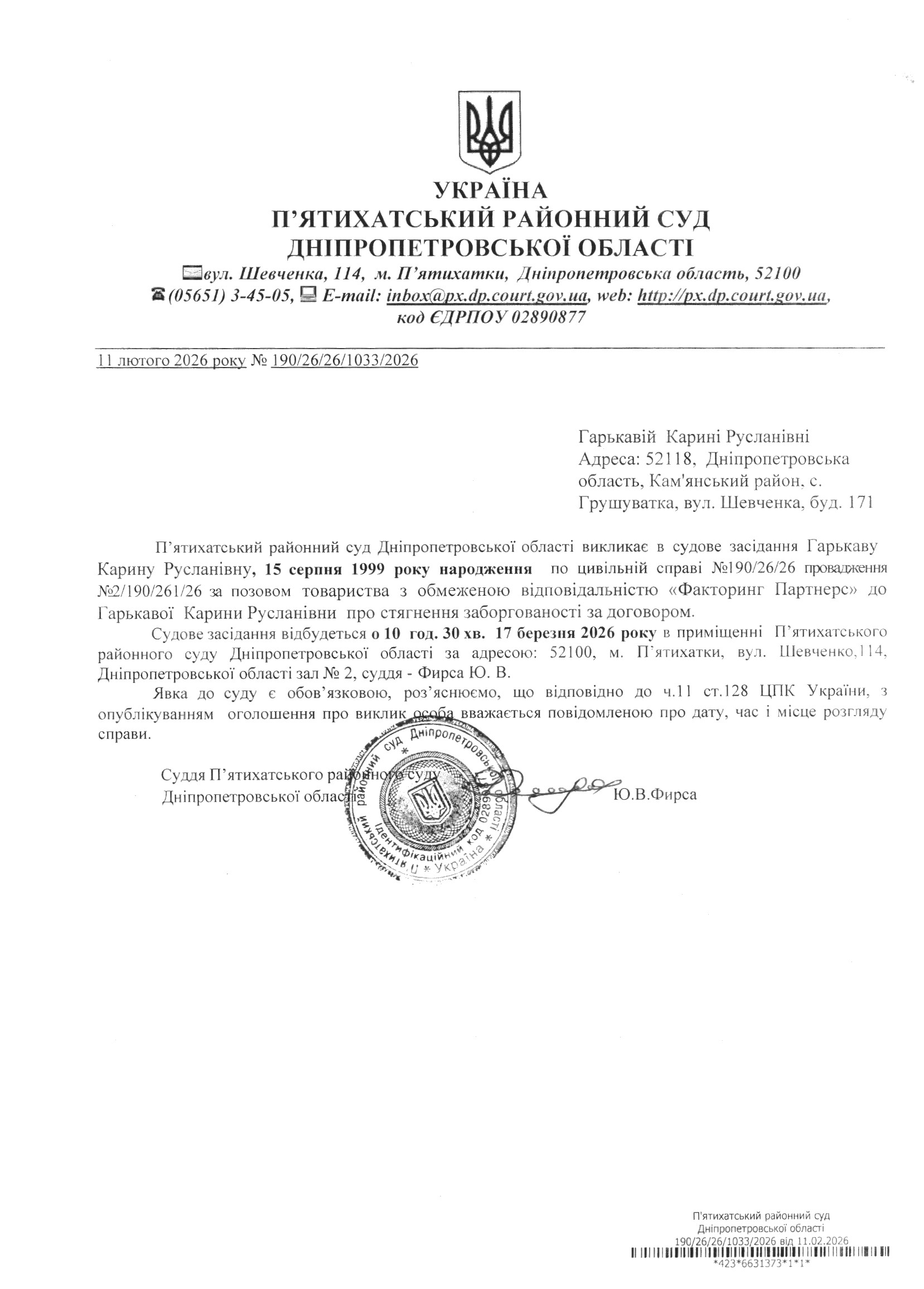 Про виклик в судове засідання Гарькава Карина Русланівна