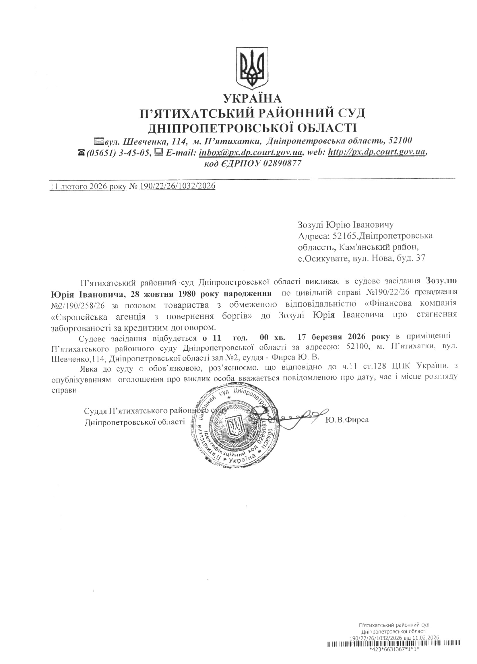 Про виклик в судове засідання Зозуля Юрій Іванович