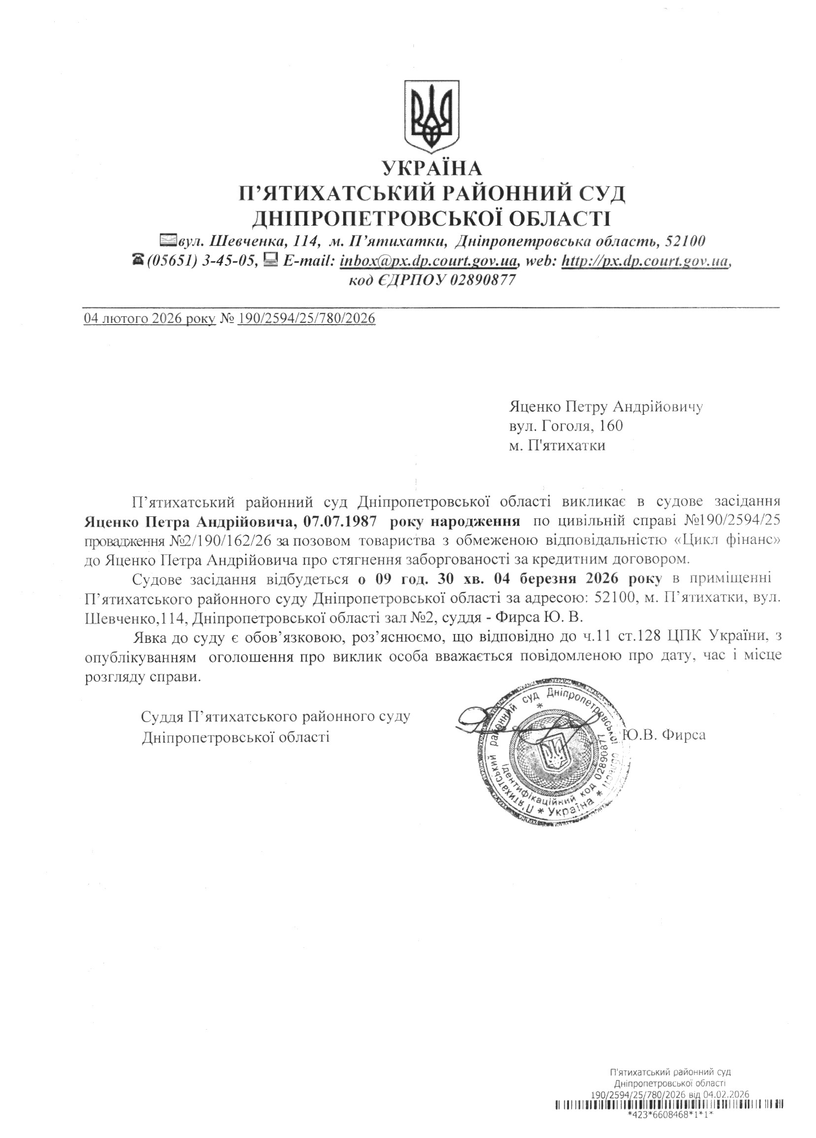 Про виклик в судове засідання Яценко Петро Андрійович