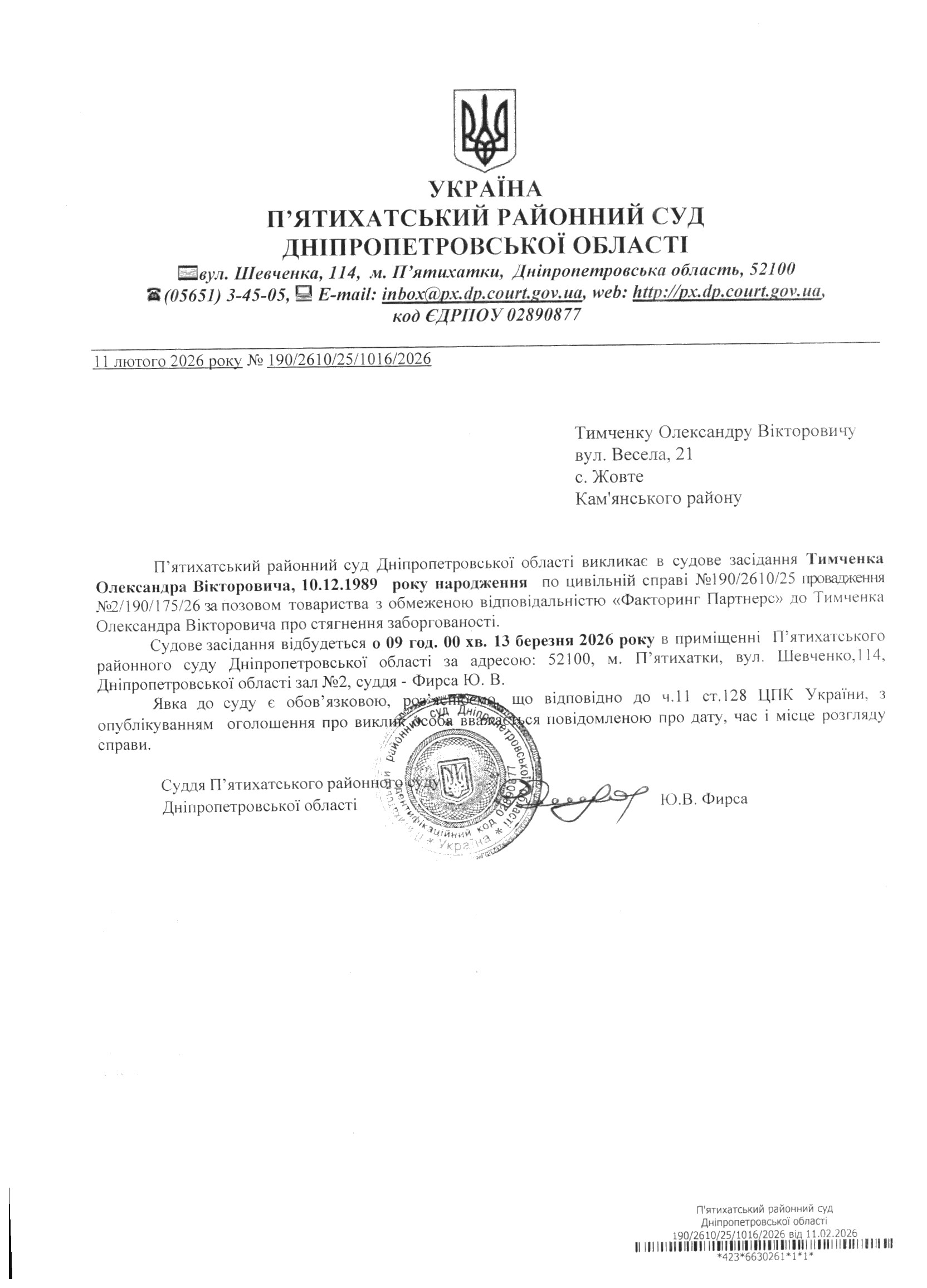 Про виклик в судове засідання Тимченко Олександр Вікторович