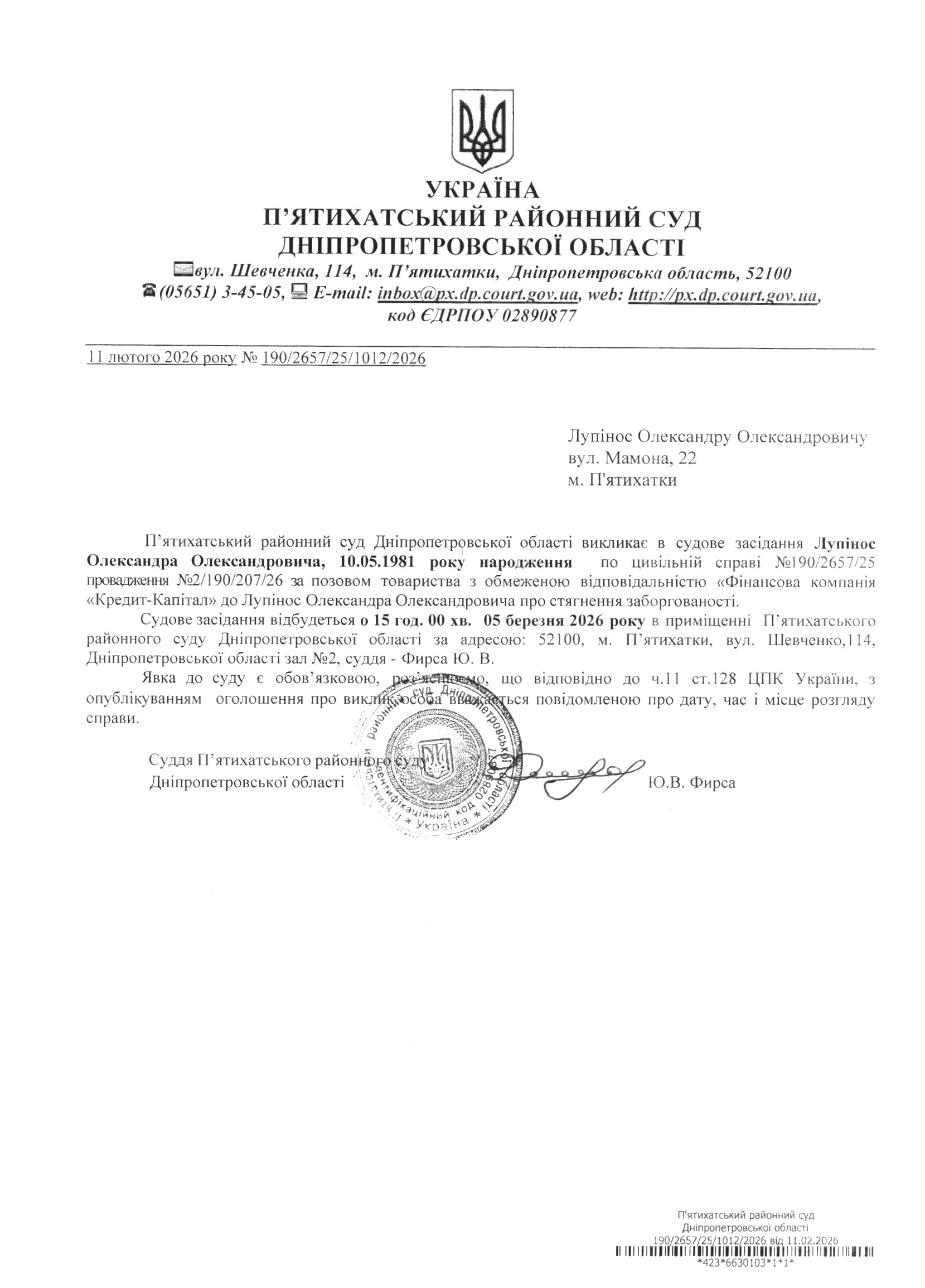 Про виклик в судове засідання Лупінос Олександр Олександрович
