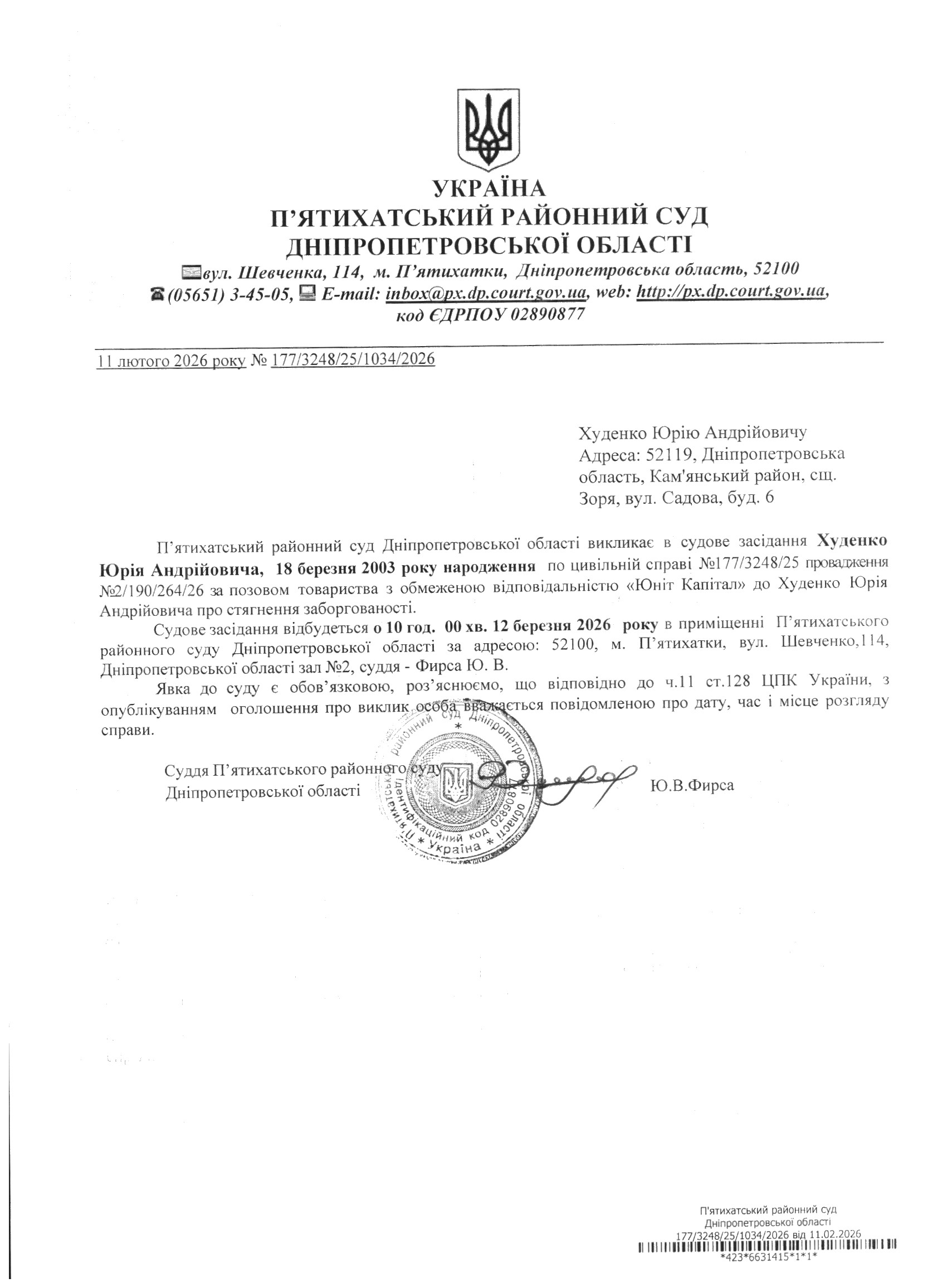 Про виклик в судове засідання Худенко Юрій Андрійович