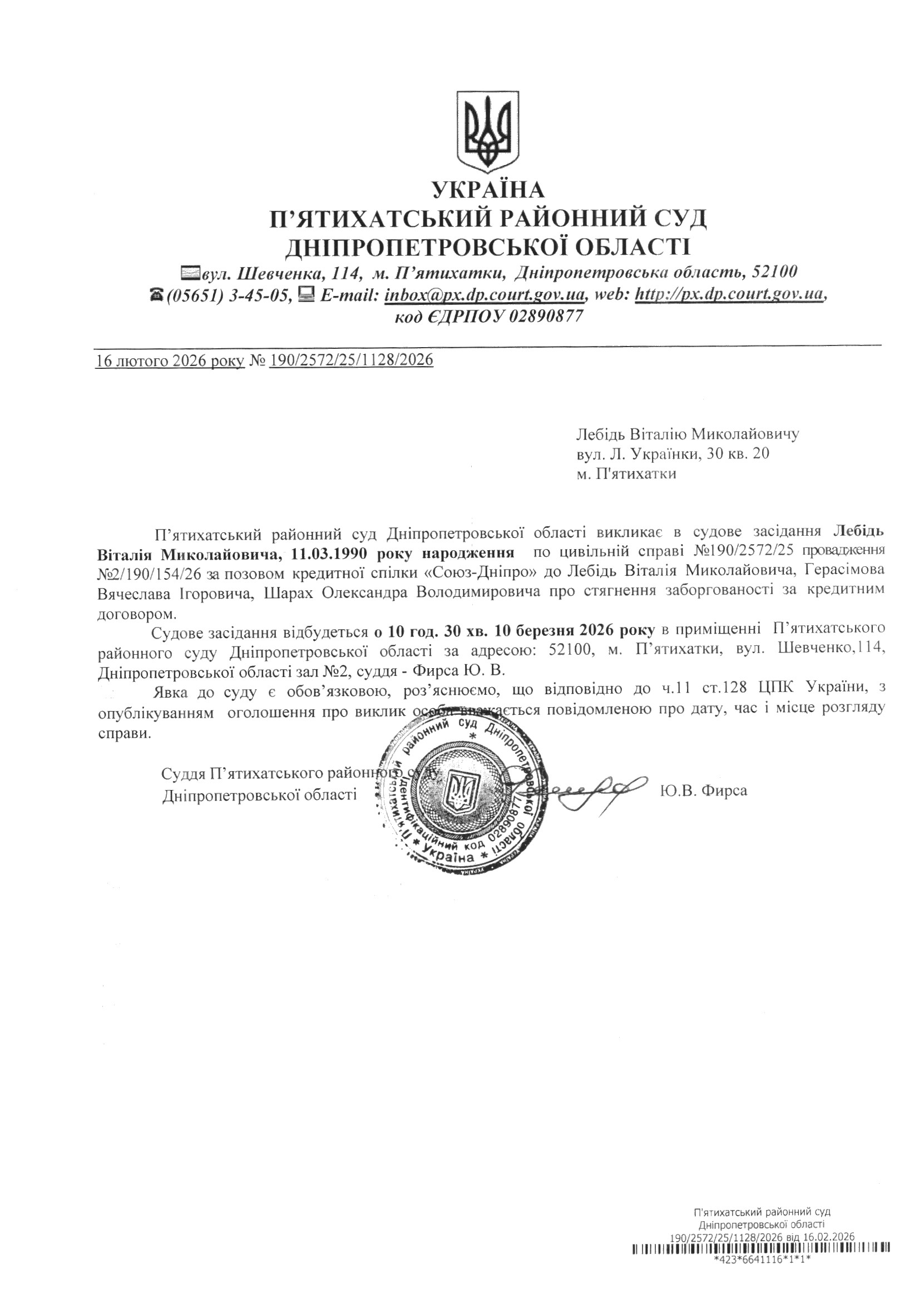 Про виклик в судове засідання Лебідь Віталій Миколайович