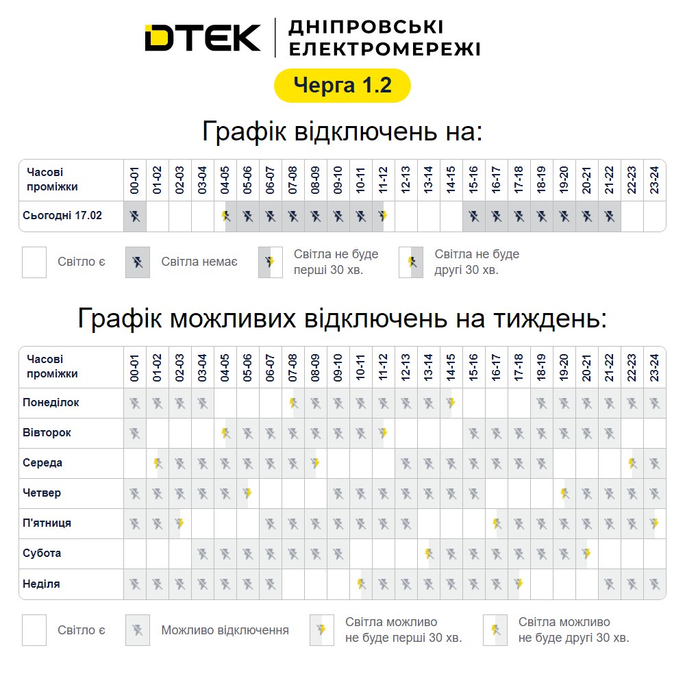 Графік стабілізаційних відключень черга 1.2 на 17.02.2026