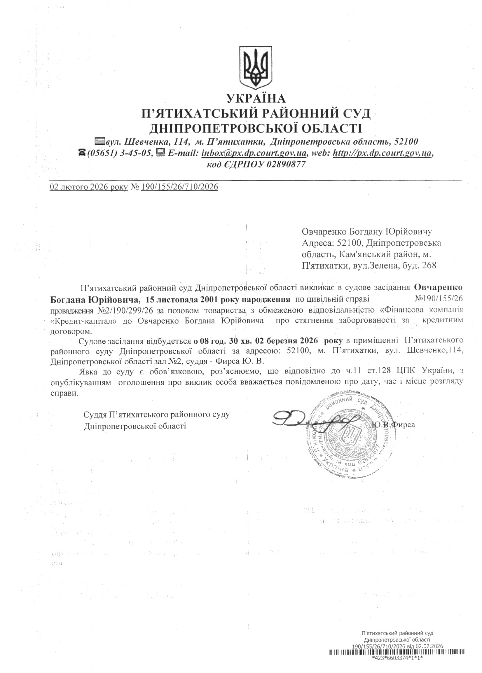 Про виклик в судове засідання Овчаренко Богдан Юрійович