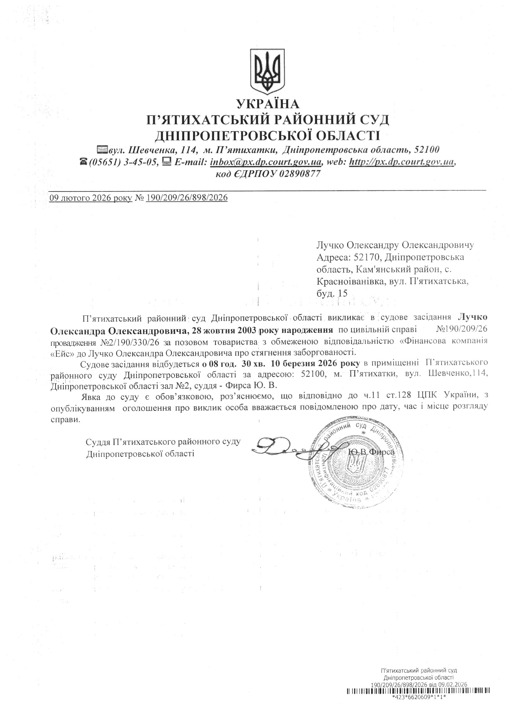 Про виклик в судове засідання Лучко Олександр Олександрович