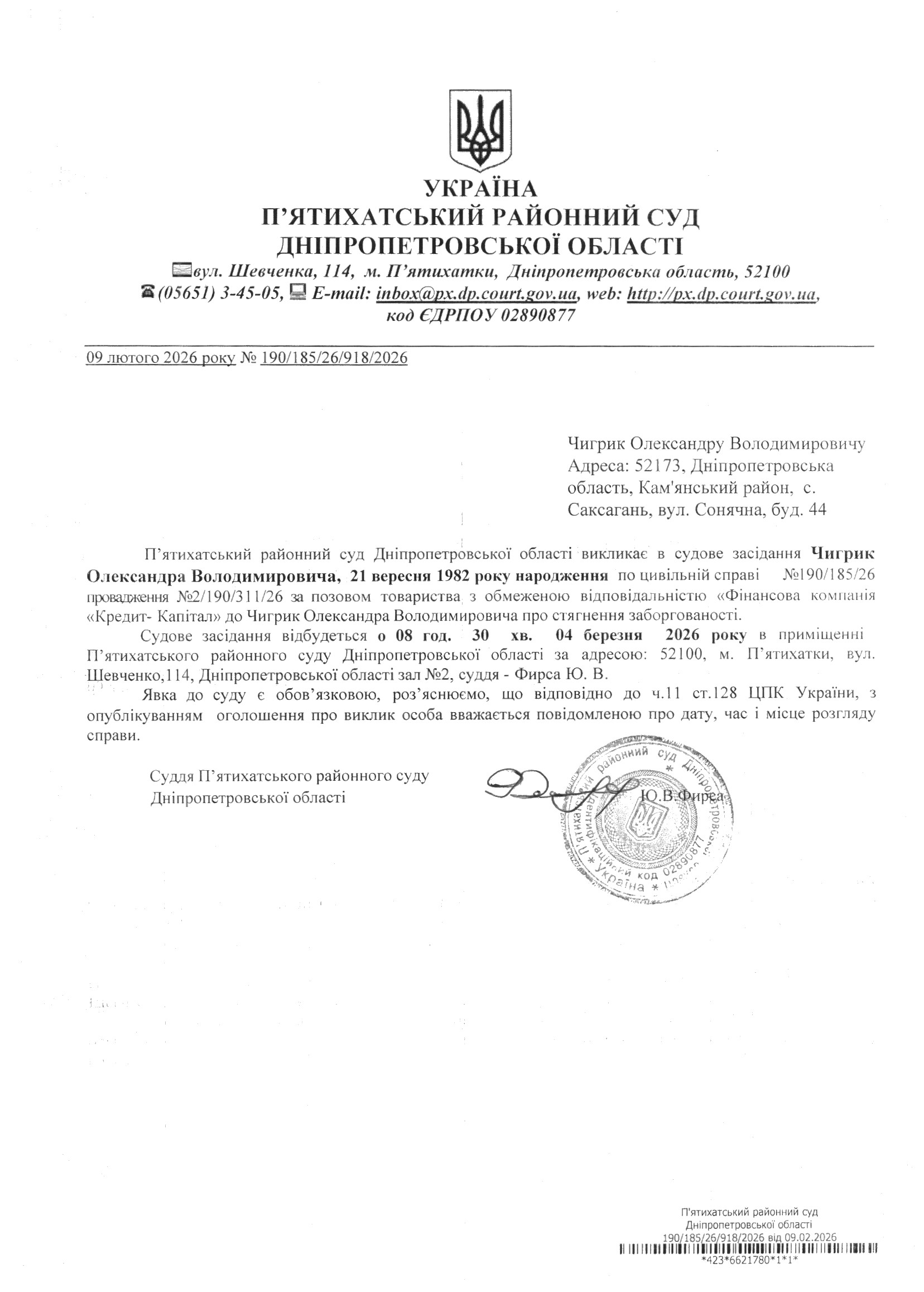 Про виклик в судове засідання Чигрик Олександр Володимирович