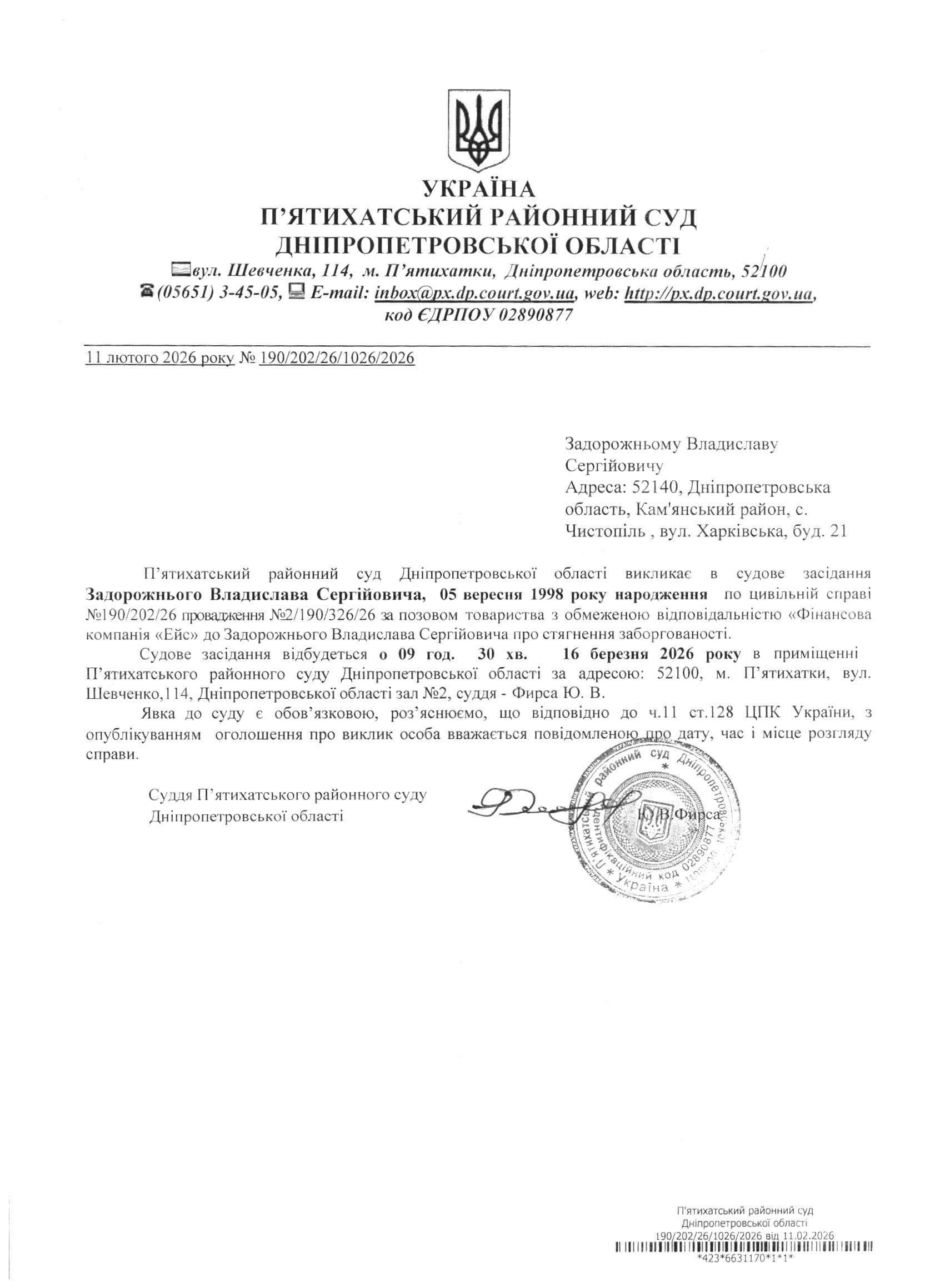 Про виклик в судове засідання Задорожній Владислав Сергійович