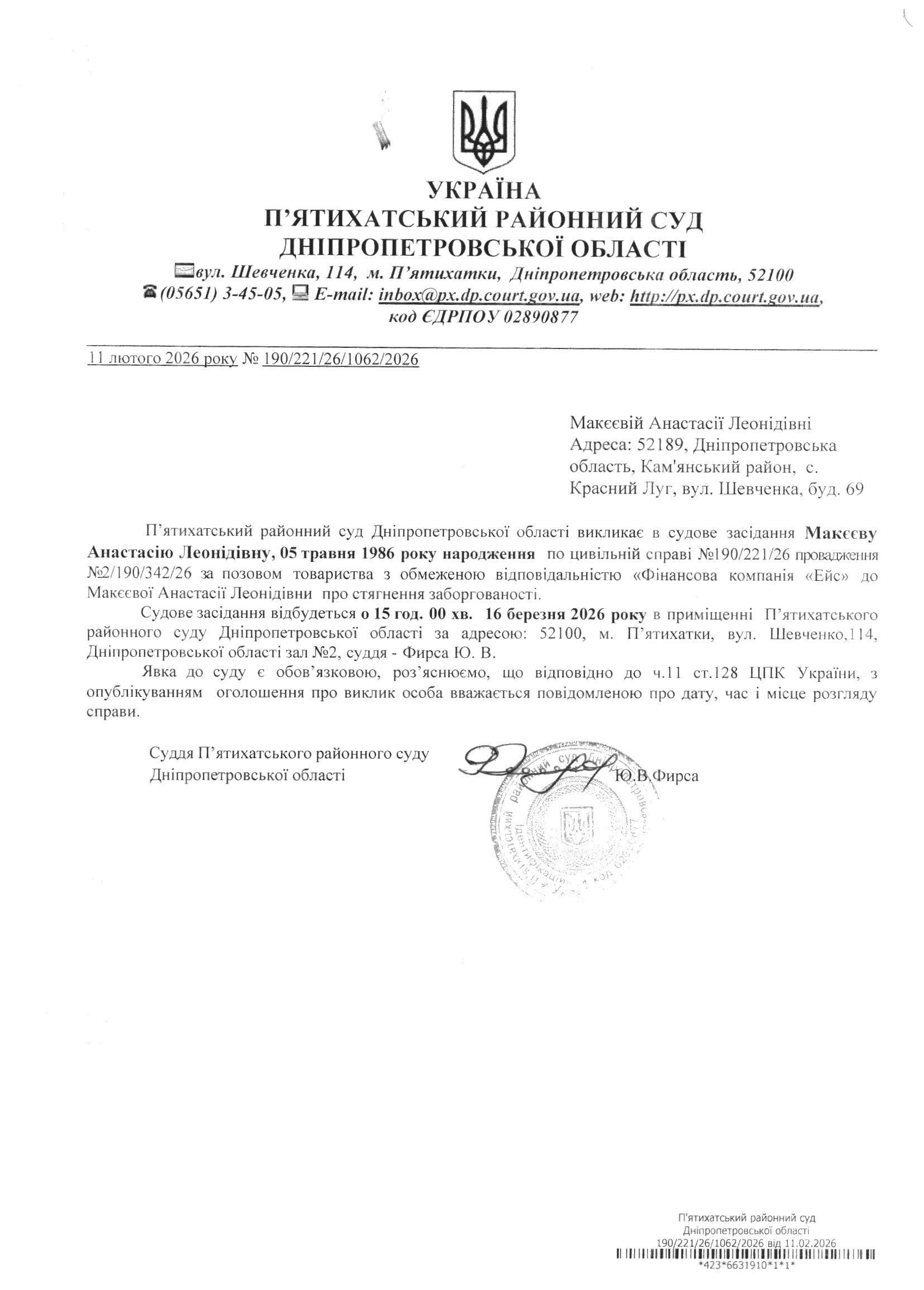 Про виклик в судове засідання Макєєва Анастасія Леонідівна
