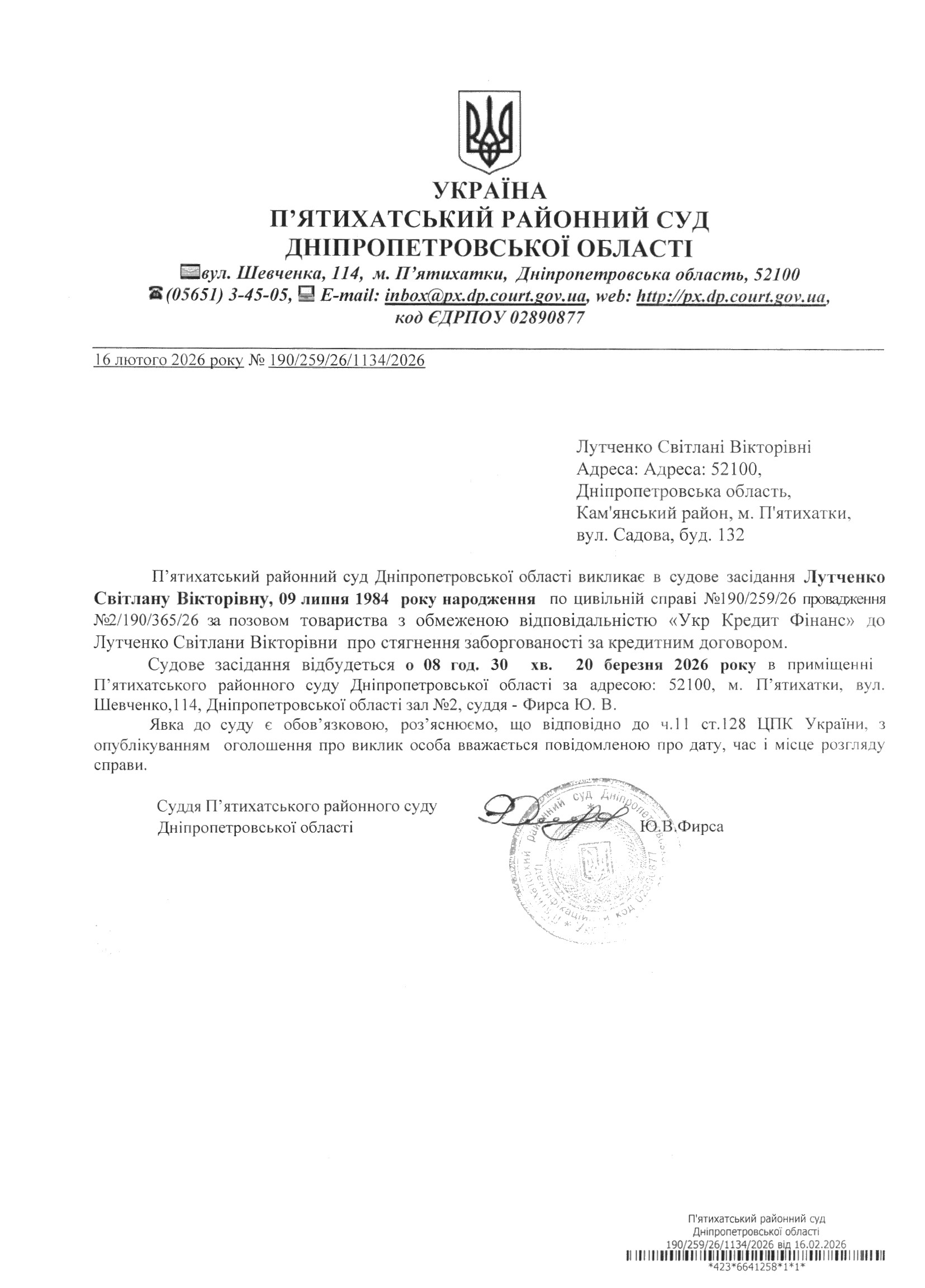 Про виклик в судове засідання Лутченко Світлана Вікторівна