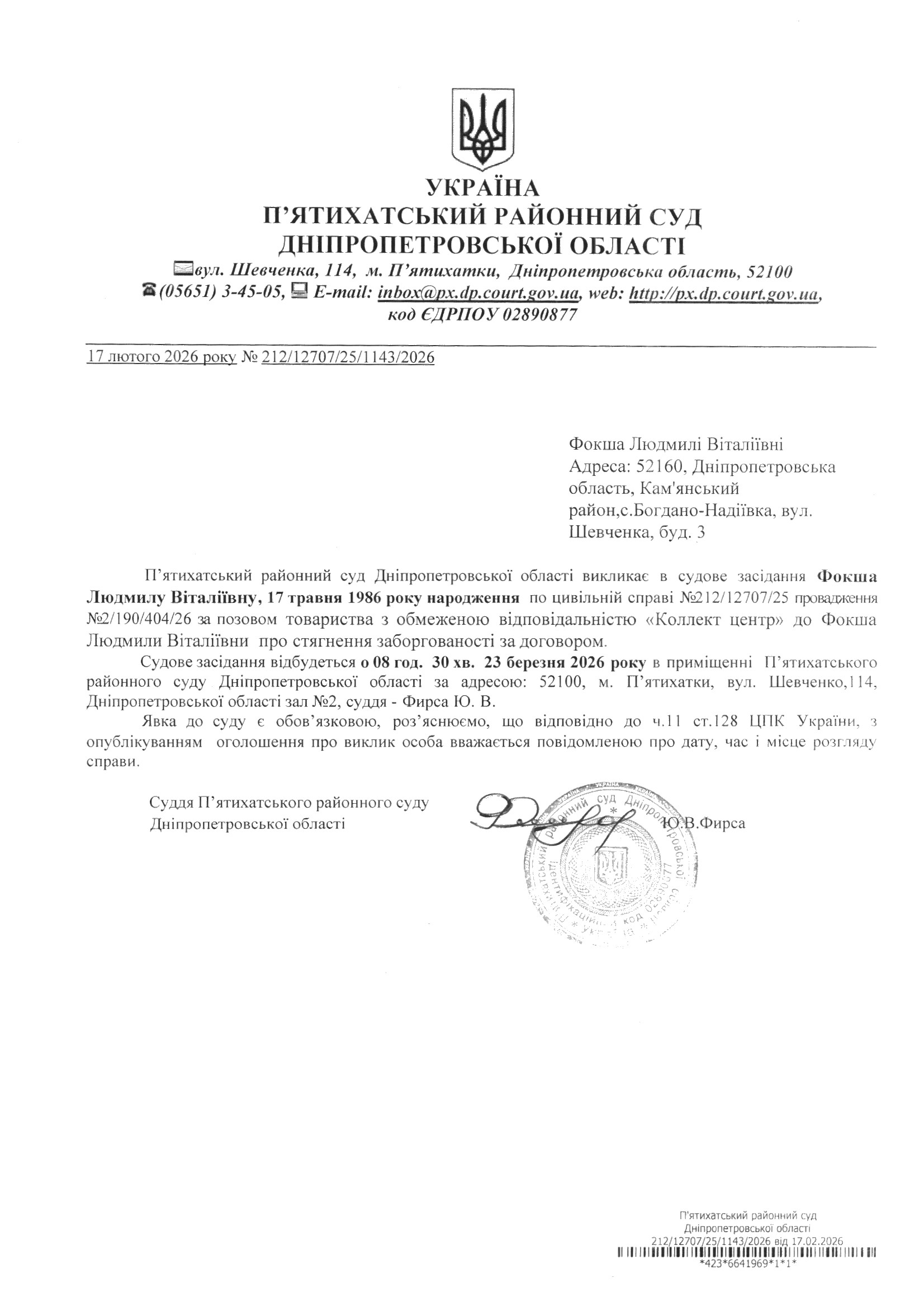 Про виклик в судове засідання Фокша Людмила ВІталіївна