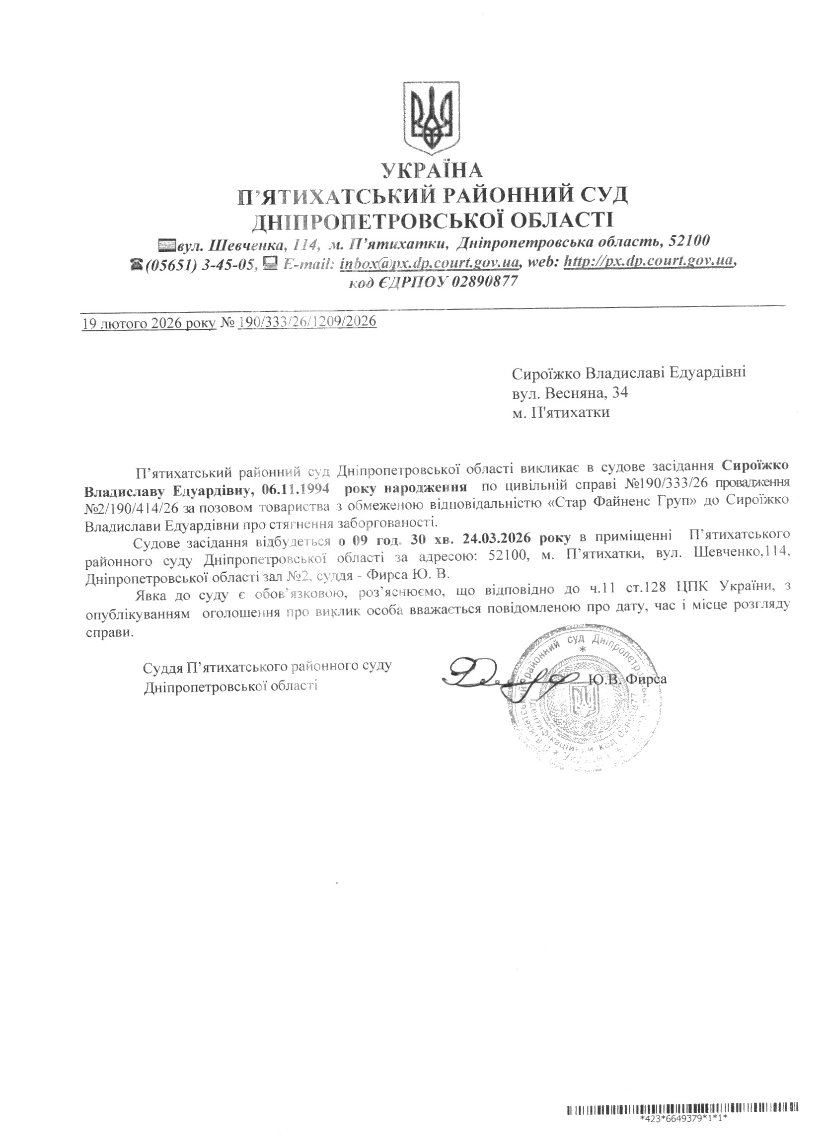 Про виклик в судове засідання Сироїжко Владислава Едуардівна