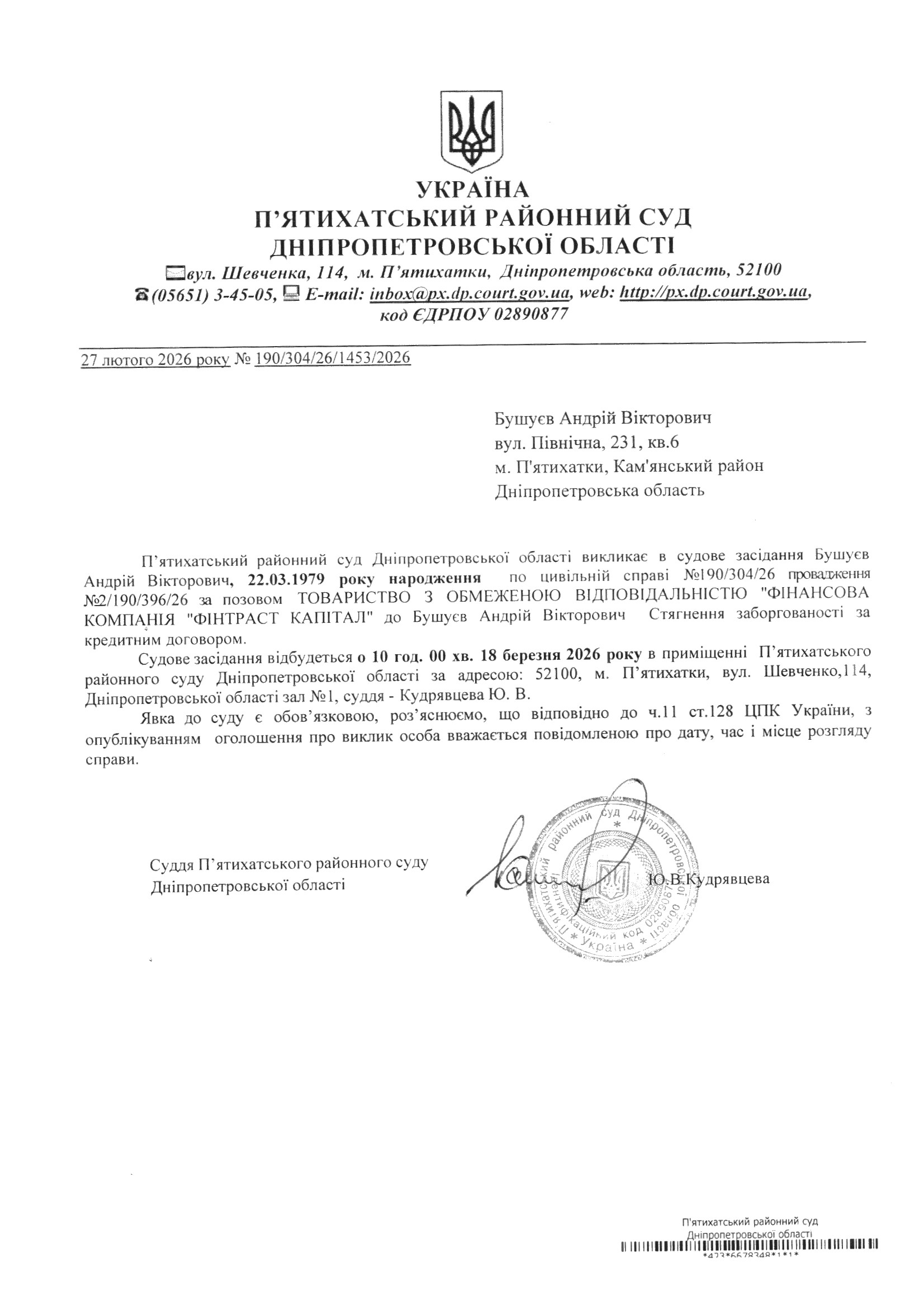 Про виклик в судове засідання Бушуєв Андрій Вікторович