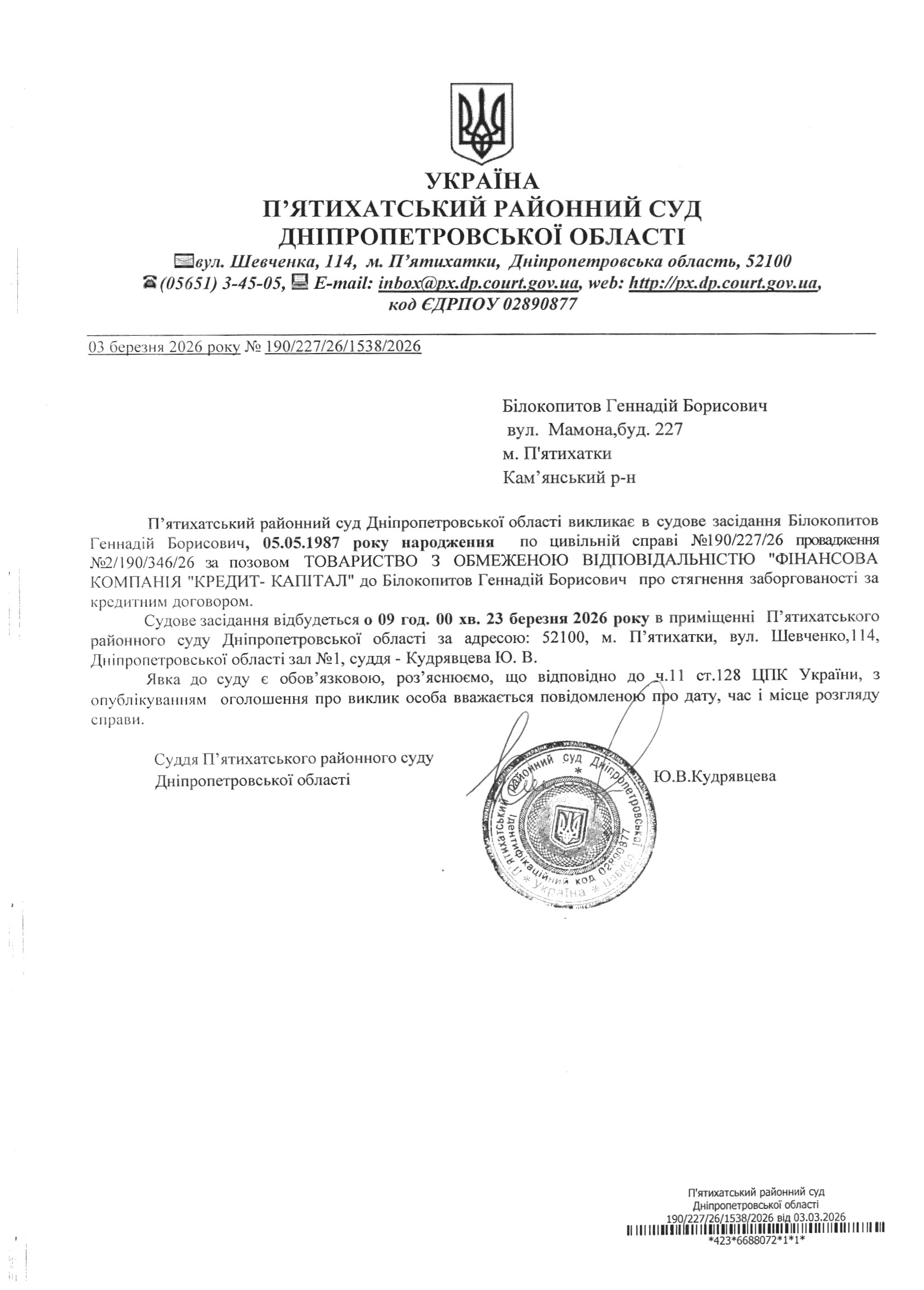 Про виклик в судове засідання Білокопитов Геннадій Борисович