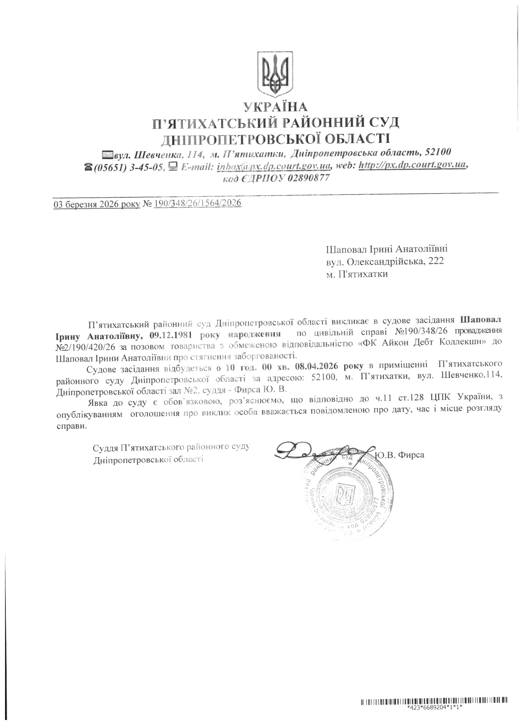 Про виклик в судове засідання Шаповал Ірина Анатоліївна