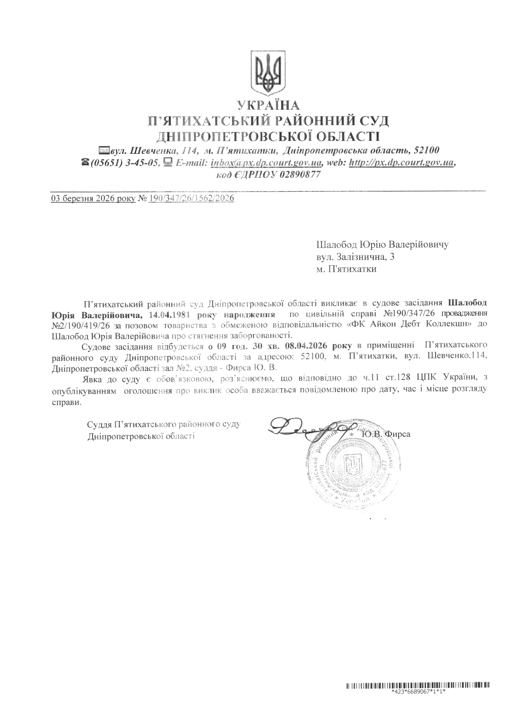 Про виклик в судове засідання Шалобод Юрій Валерійович