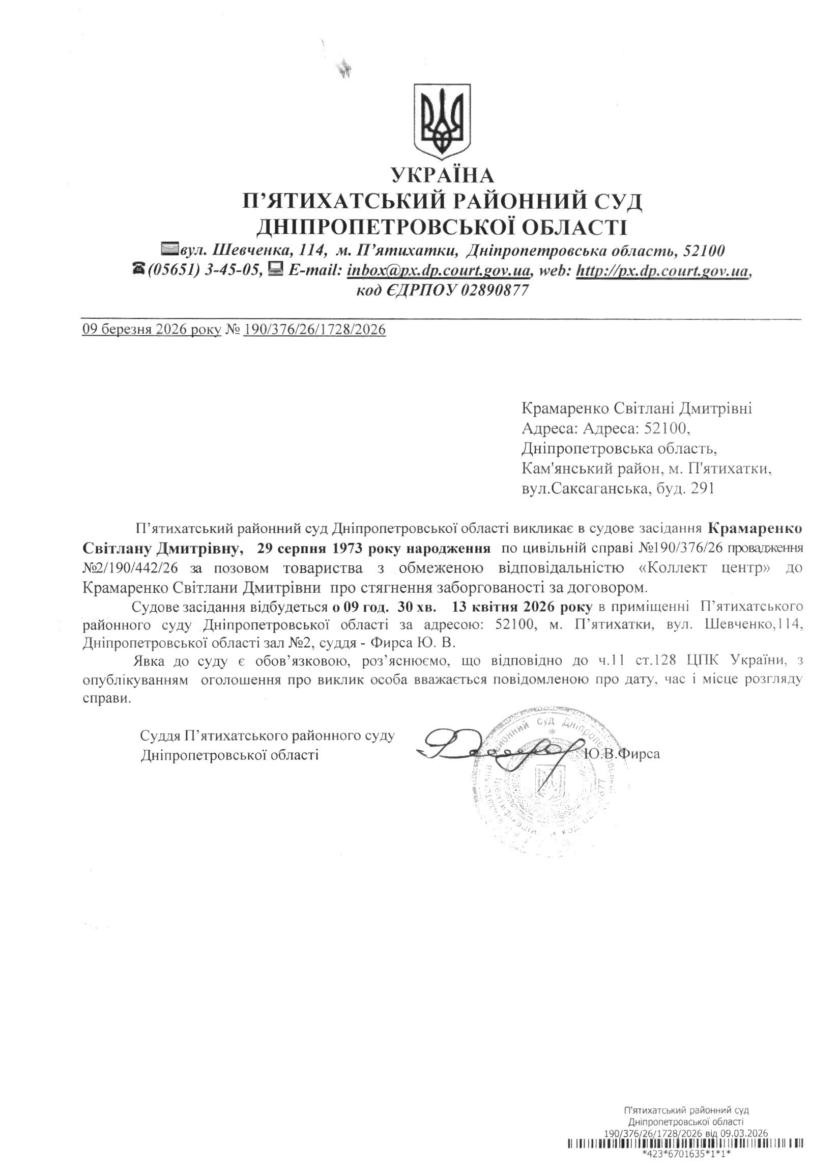 Про виклик в судове засідання Крамаренко Світлана Дмитрівна