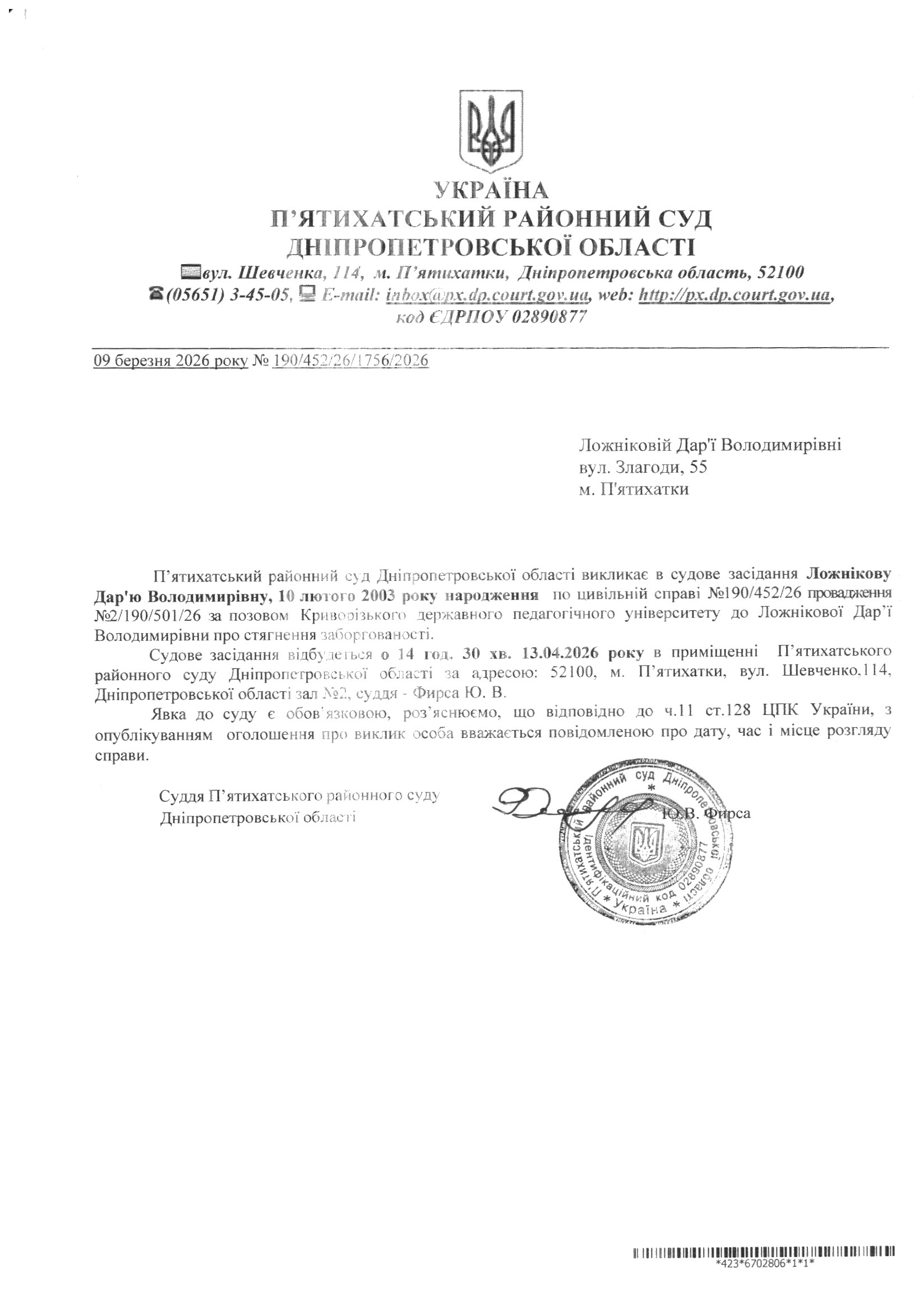 Про виклик в судове засідання Ложнікова Дар'я Володимирівна