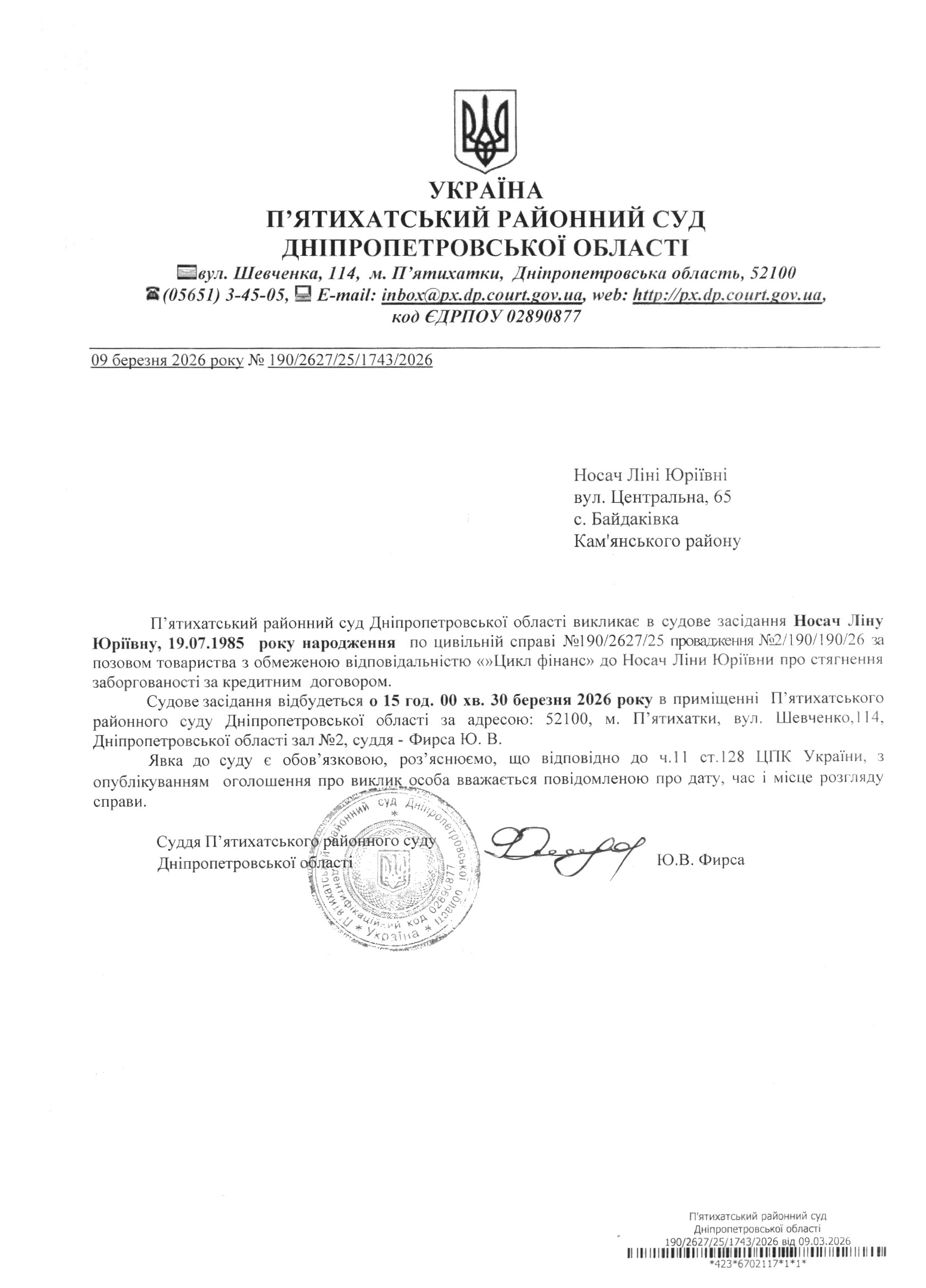 Про виклик в судове засідання Носач Ліна Юріївна