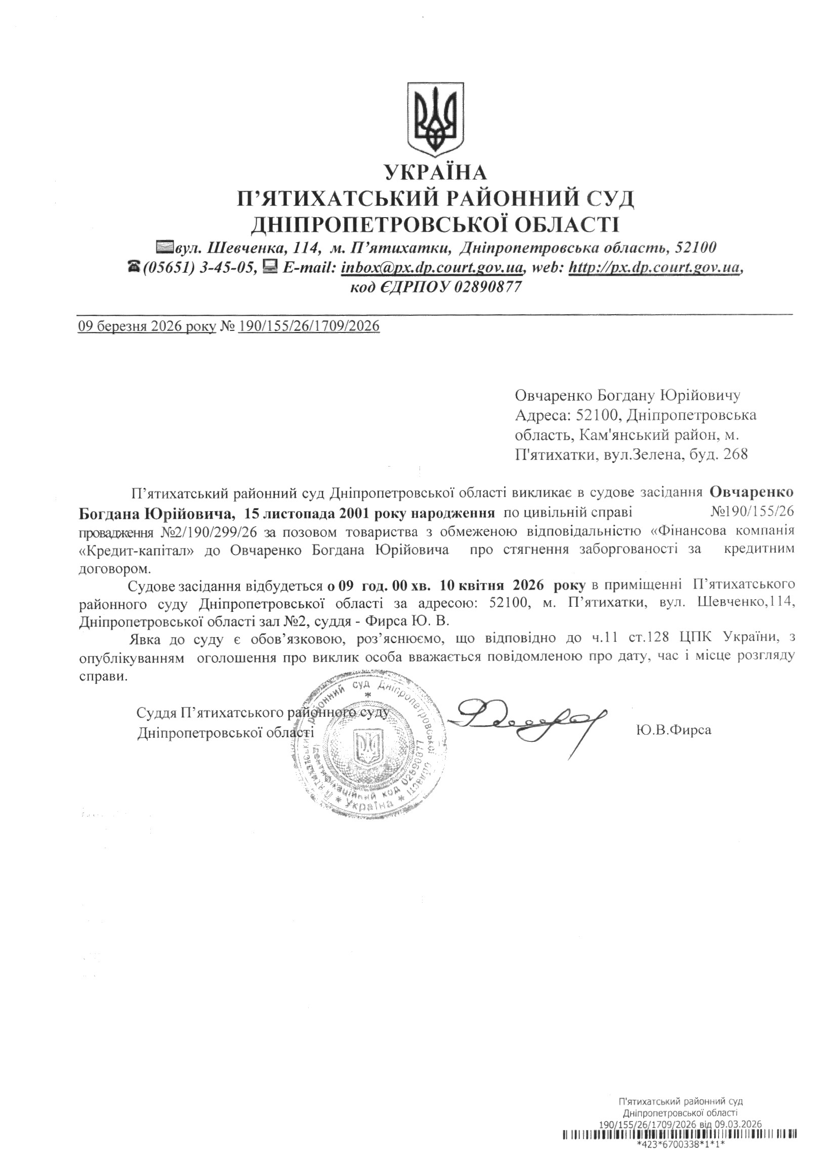 Про виклик в судове засідання Овчаренко Богдан Юрійович
