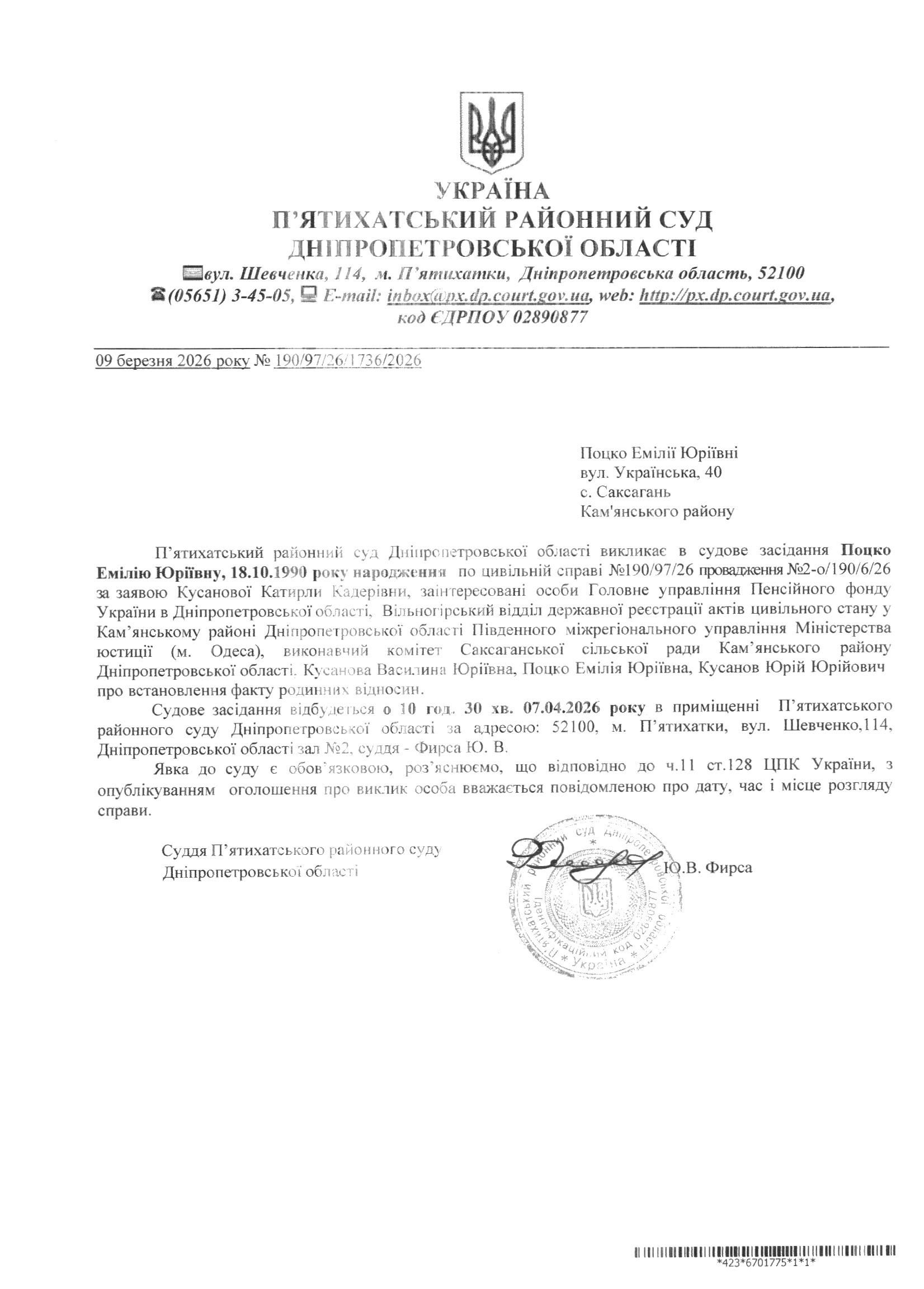 Про виклик в судове засідання Поцко Емілія Юріївна