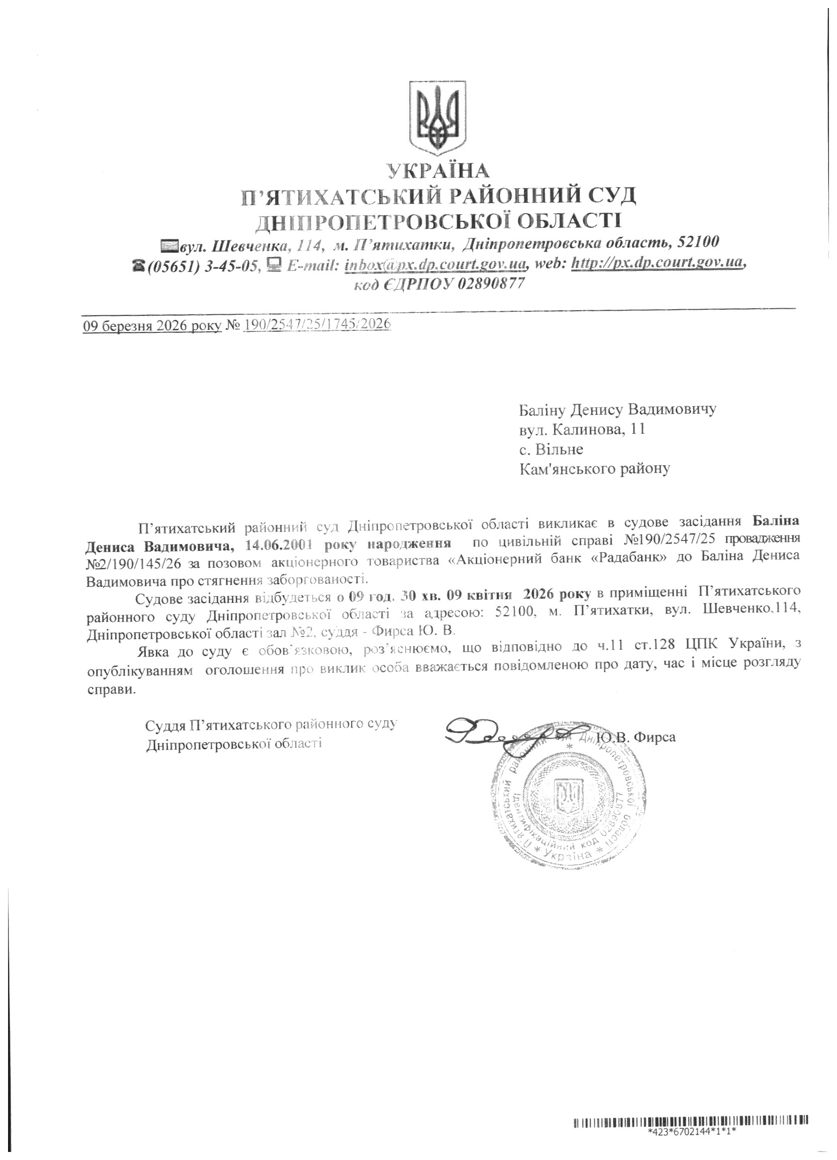 Про виклик в судове засідання Балін Денис Вадимович